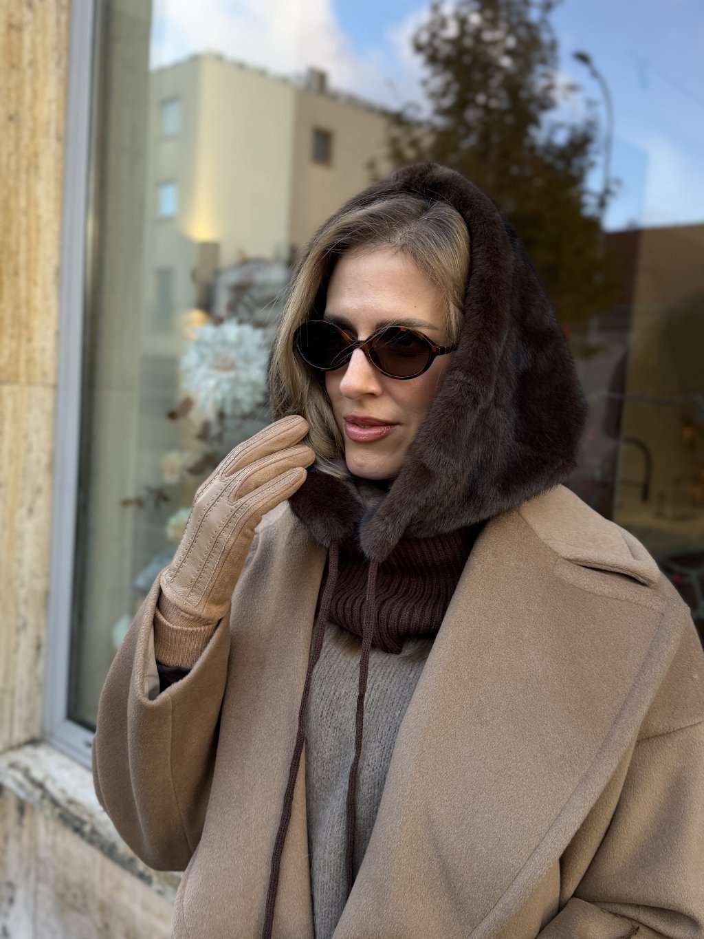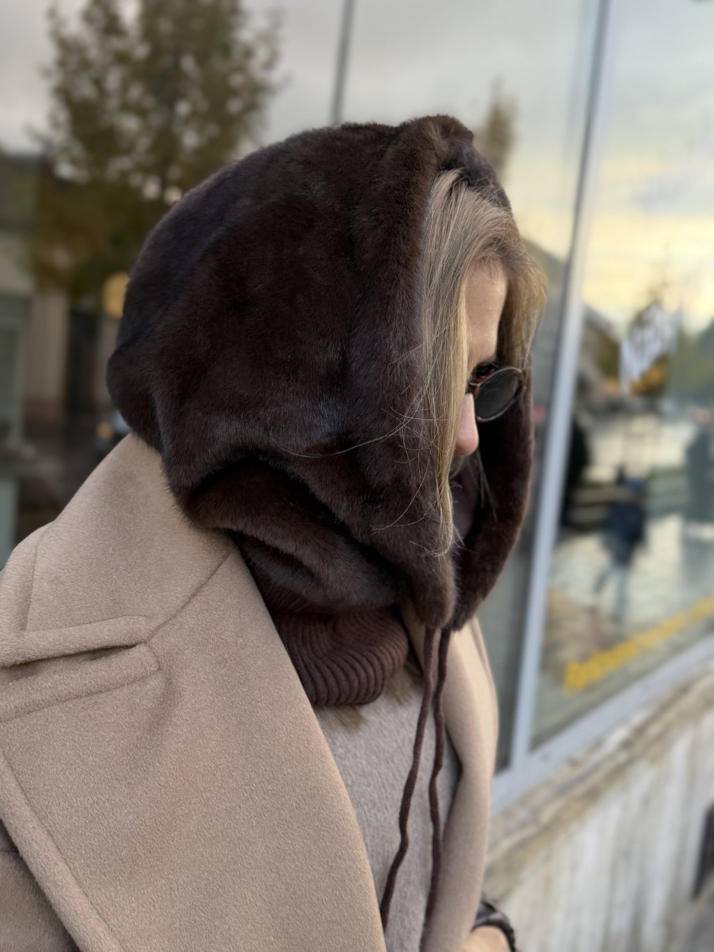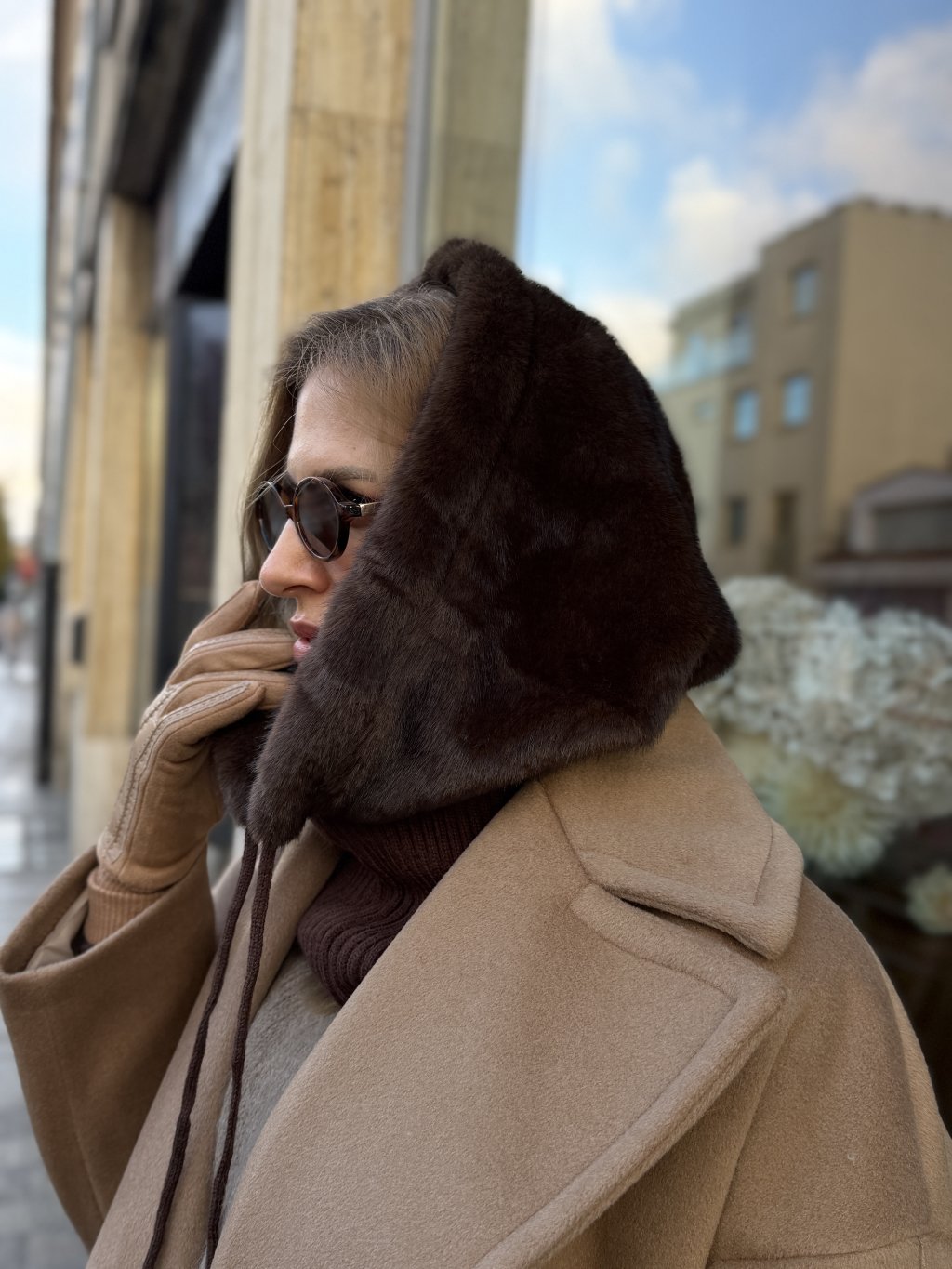 Mäkká a nadýchaná balaklava v tmavohnedom odtieni pôsobí luxusne, žensky a dokonale hreje. Jemný kožušinový efekt dodáva celému outfitu elegantný zimný nádych, pričom praktický strih s kapucňou ti poskytne príjemnú ochranu pred chladom aj vetrom.