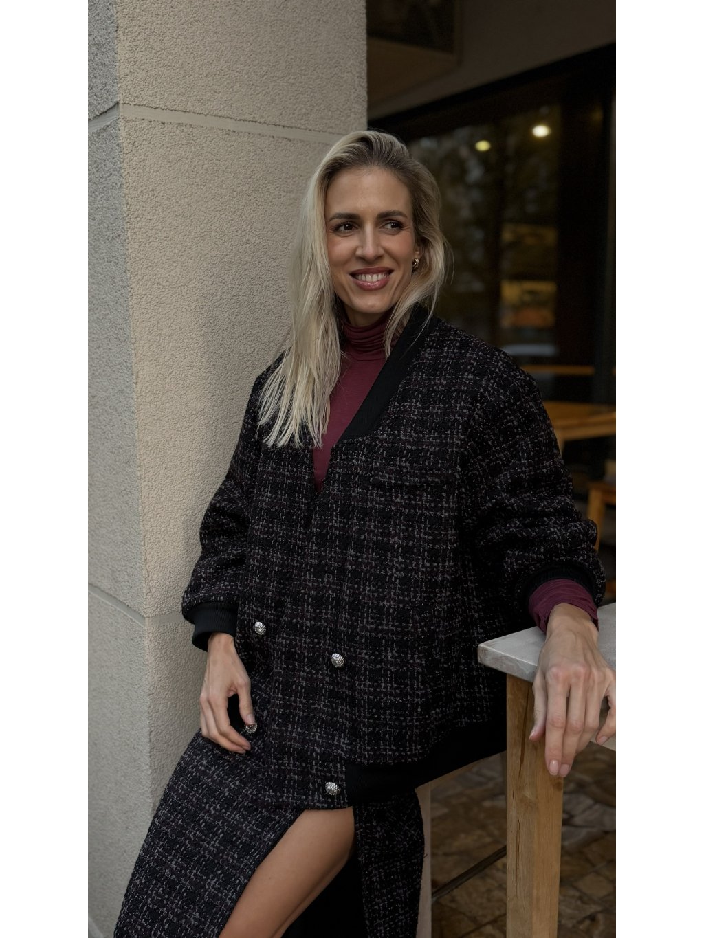 Kabátová bomber bunda v čierno-burgundy odtieni spája eleganciu kabáta so športovou uvoľnenosťou. Štruktúrovaná látka a výrazné gombíky jej dodávajú luxusný charakter, ktorý vynikne na každodennom outfite. Je to presne ten typ vrstvy, ktorá pôsobí štýlovo bez námahy.