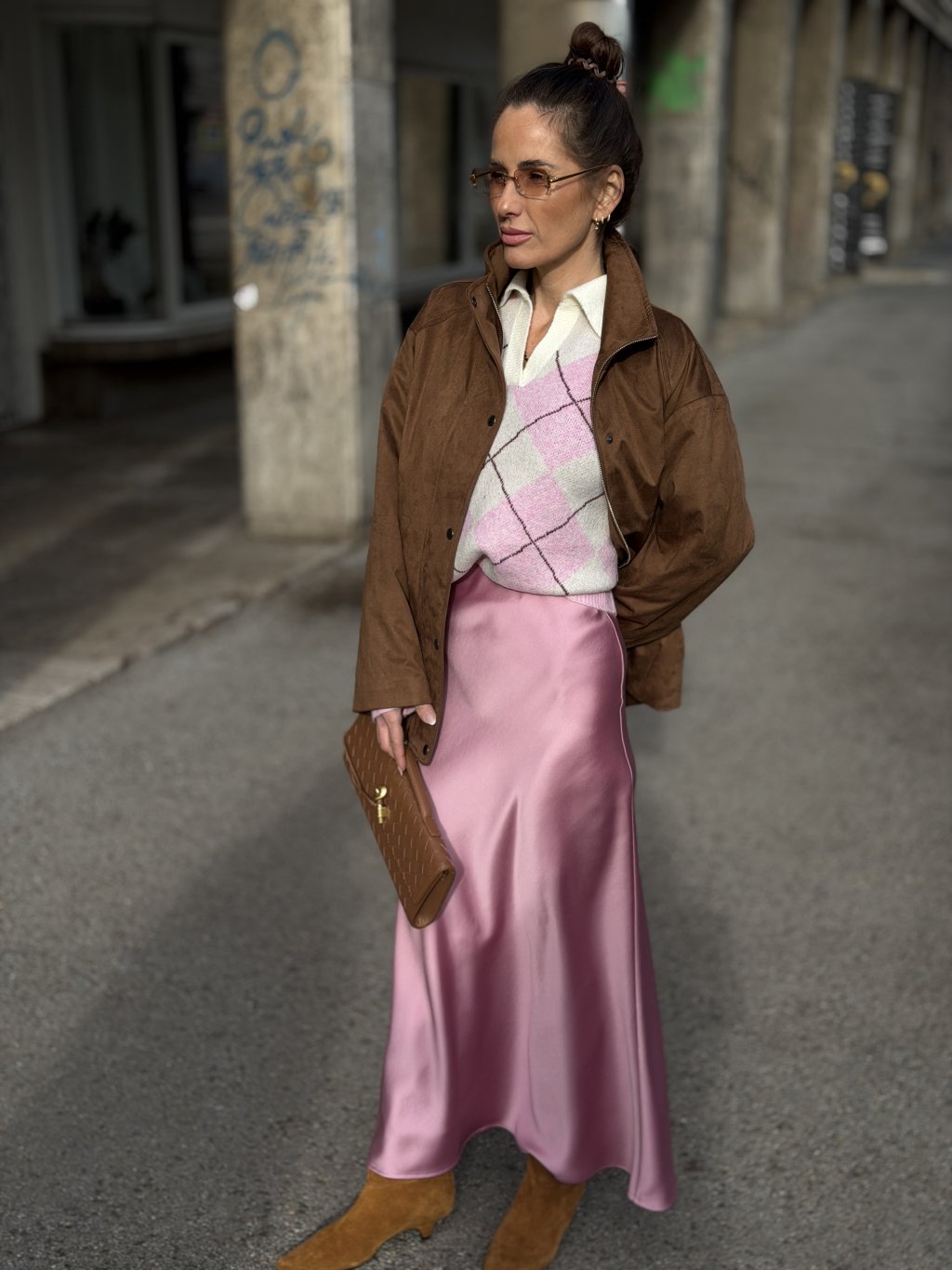 Noste ju s úpletom alebo jemným svetrom a doplň širokými nohavicami alebo denimom. Skvele funguje aj v kombinácii s koženými doplnkami – napríklad s kabelkou.