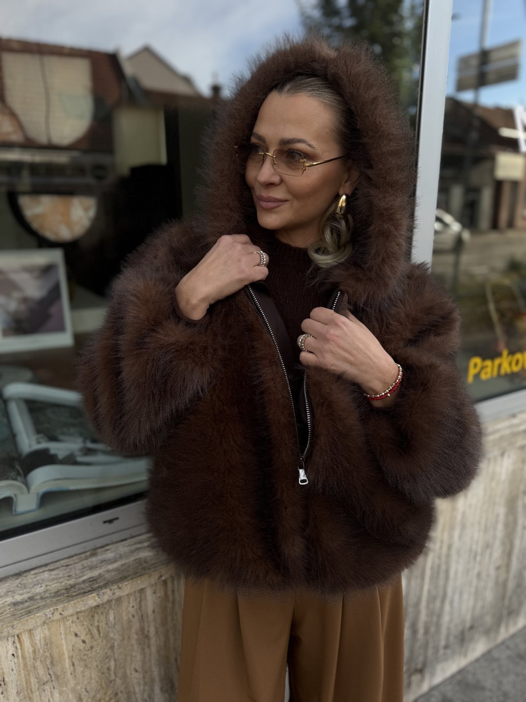 Bohatá, nadýchaná štruktúra v odtieni čokoládovej hnedej okamžite dodá outfitu noblesu aj filmový glamour ✨. Extra mäkký “fur” efekt pôsobí luxusne a zároveň príjemne hreje počas chladných dní. Model má praktickú kapucňu, ideálnu pre mestské prechádzky, večerné stylingy aj elegantné zimné kombinácie.