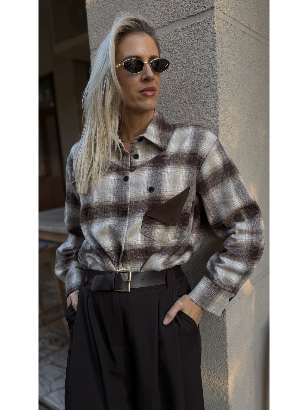 Hnedá flanelová košeľa s jemným károm pôsobí teplo, uvoľnene a veľmi žensky. Materiál je mäkký na dotyk, príjemne hrejivý, no zároveň ľahký – ideálny na vrstvenie počas jesene a zimy.
