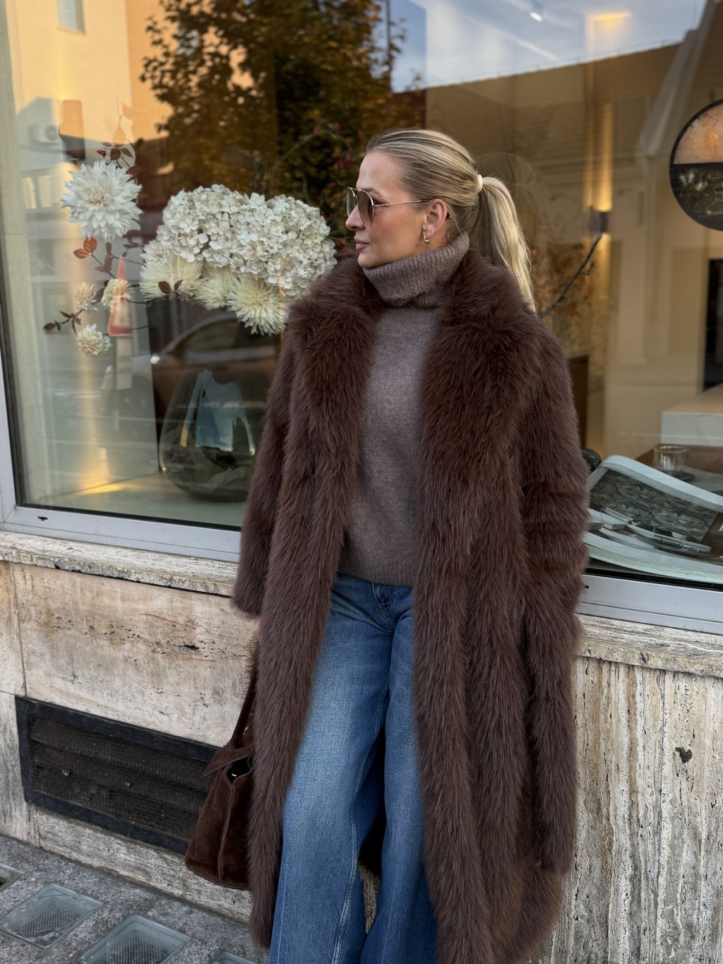 Dlhý a nadýchaný kožušinový kabát Imperial s opaskom, ktorý dodá zimným outfitom luxus a eleganciu. Teplý, štruktúrovaný a výrazný.