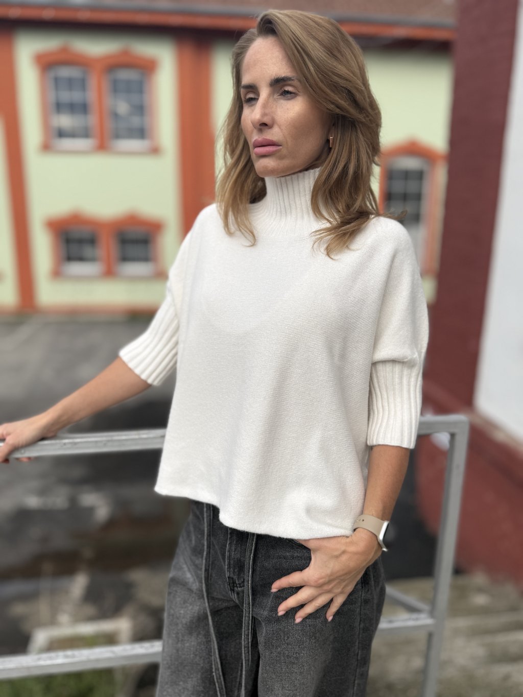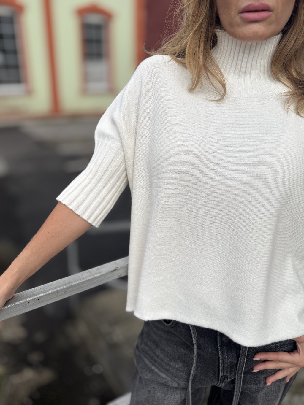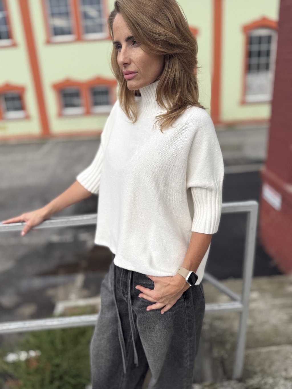 Krémový sveter s krátkym rukávom a rolákovým golierom je esenciou minimalistickej elegancie. Vyrobený z mäkkého, príjemného úpletu, ktorý pôsobí luxusne na dotyk, ponúka dokonalú rovnováhu medzi ležérnosťou a ženskosťou. Vďaka voľnejšiemu strihu krásne padne na postavu a umožňuje vrstvenie – či už pod sako, alebo cez košeľu. Tento kúsok sa stane univerzálnym základom jesenného aj zimného šatníka.