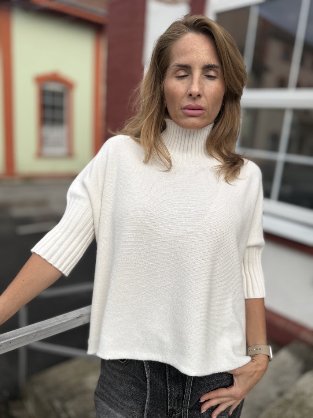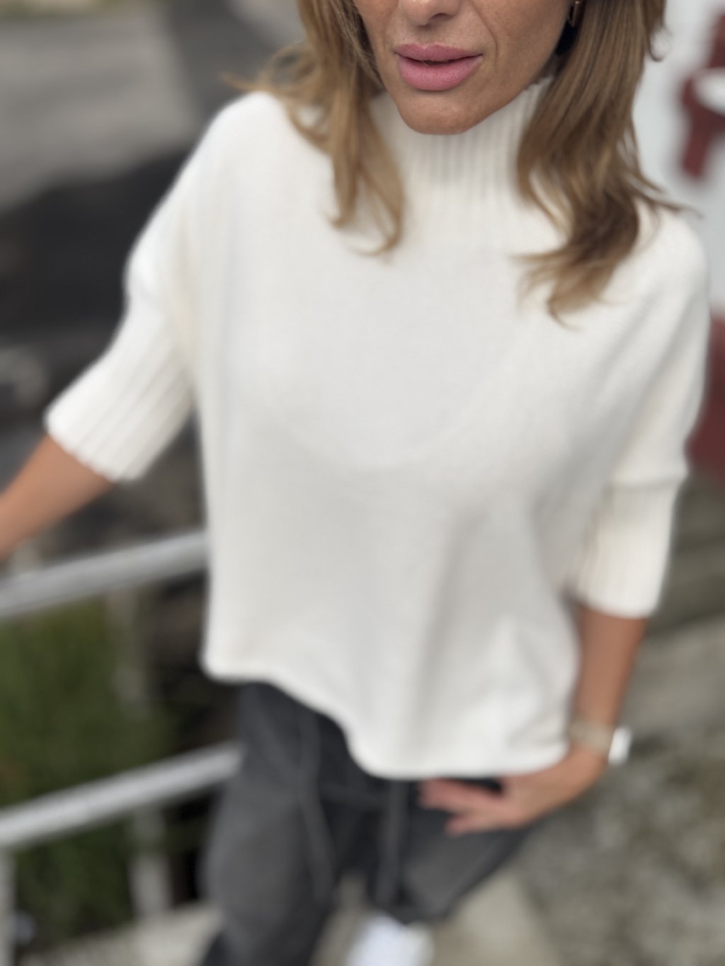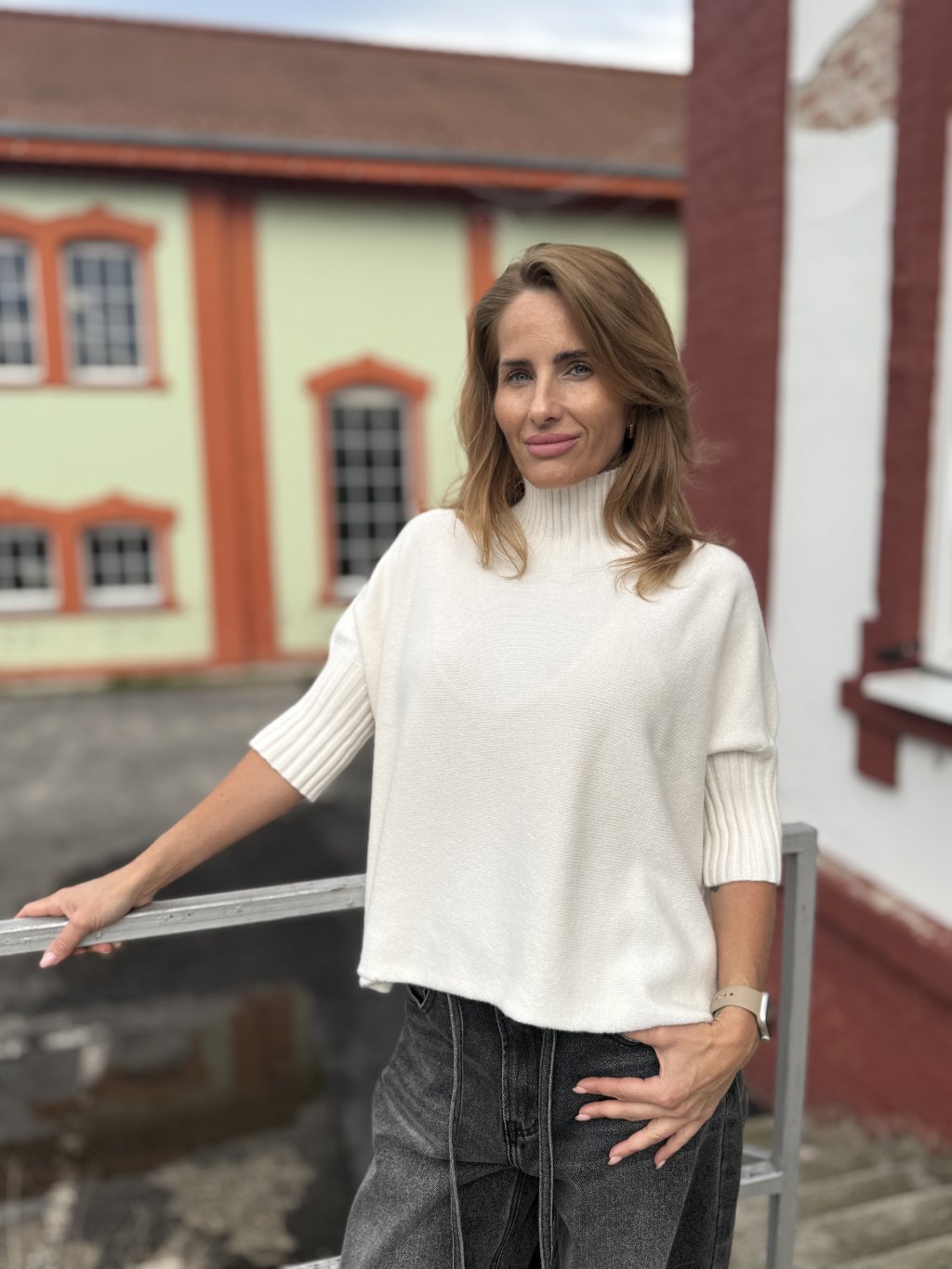Krémový sveter s krátkym rukávom a rolákovým golierom je esenciou minimalistickej elegancie. Vyrobený z mäkkého, príjemného úpletu, ktorý pôsobí luxusne na dotyk, ponúka dokonalú rovnováhu medzi ležérnosťou a ženskosťou. Vďaka voľnejšiemu strihu krásne padne na postavu a umožňuje vrstvenie – či už pod sako, alebo cez košeľu. Tento kúsok sa stane univerzálnym základom jesenného aj zimného šatníka.