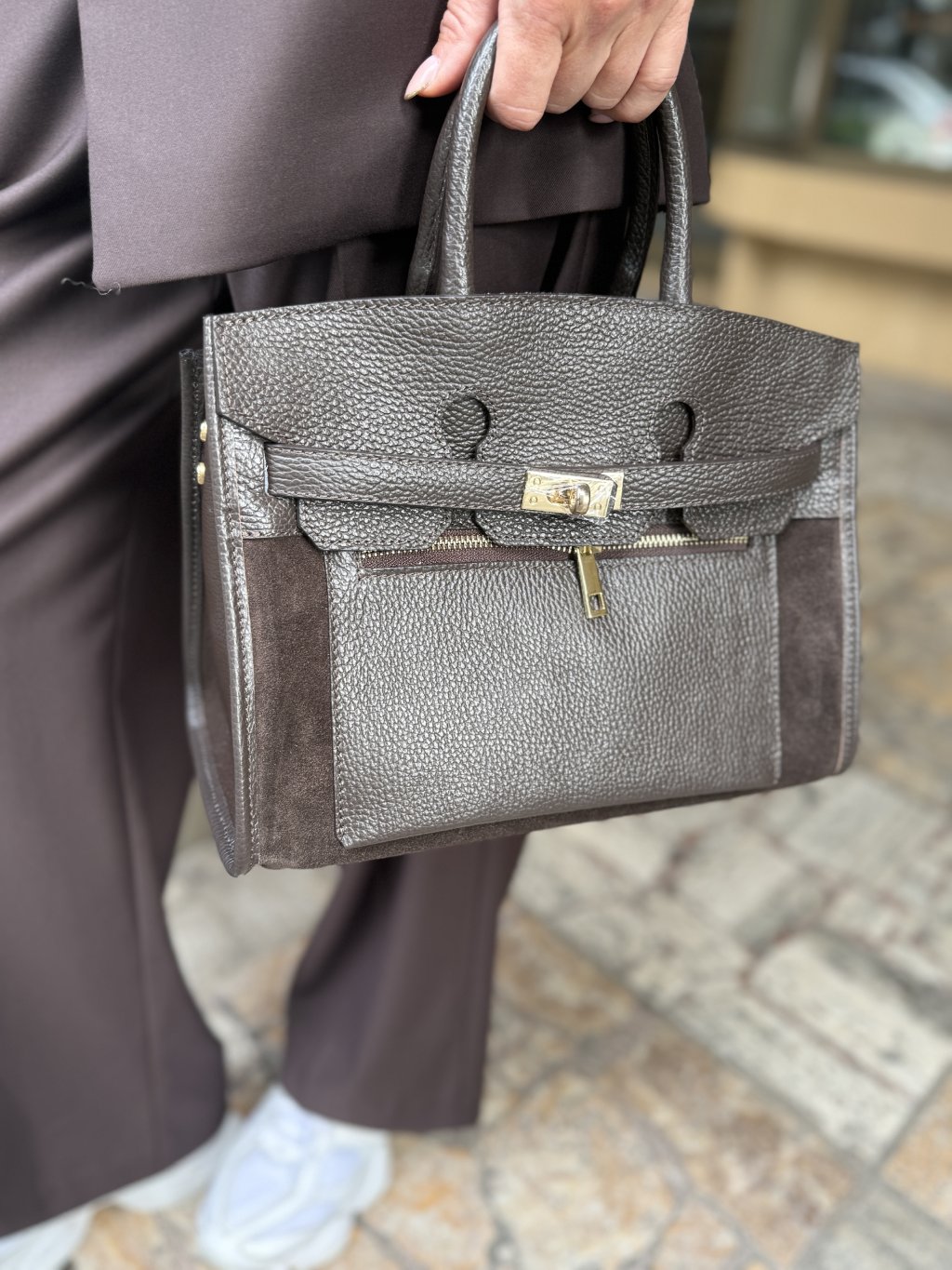 Táto hnedá štruktúrovaná kabelka z pravej kože a semišu v čokoládovom odtieni pôsobí luxusne a nadčasovo. Elegantný dizajn s jemným zrnitým povrchom dopĺňa praktické predné vrecko na zips a decentné kovové zapínanie v zlatej farbe. Kabelka je dostatočne priestranná na každodenné nosenie – pojme dokumenty, peňaženku aj menšie elektronické zariadenia. Pevné krátke držadlá zaručujú komfortné nosenie v ruke.