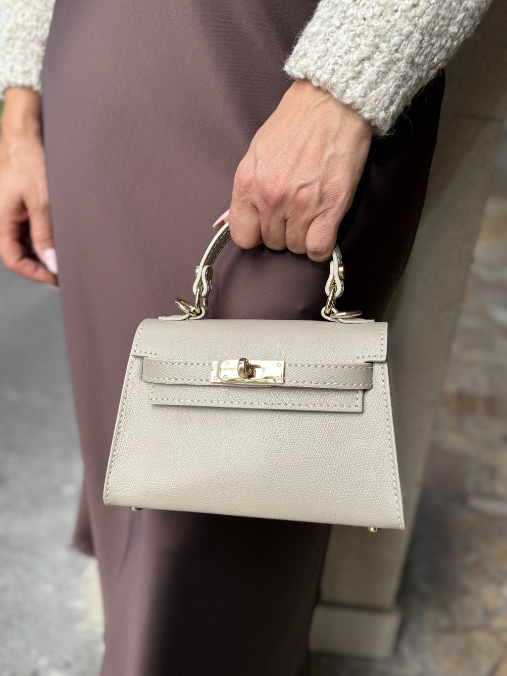 Jemná béžová kožená mini kabelka zaujme svojím nadčasovým tvarom a decentnou eleganciou. Štruktúrovaný povrch z pravej kože v kombinácii so zlatým kovovým zapínaním pôsobí luxusne a sofistikovane. Kompaktný rozmer robí z kabelky ideálneho spoločníka na špeciálne príležitosti – od večierkov cez svadby až po romantické večere. Napriek malej veľkosti pojme všetky nevyhnutnosti, ako je telefón, peňaženka či rúž.