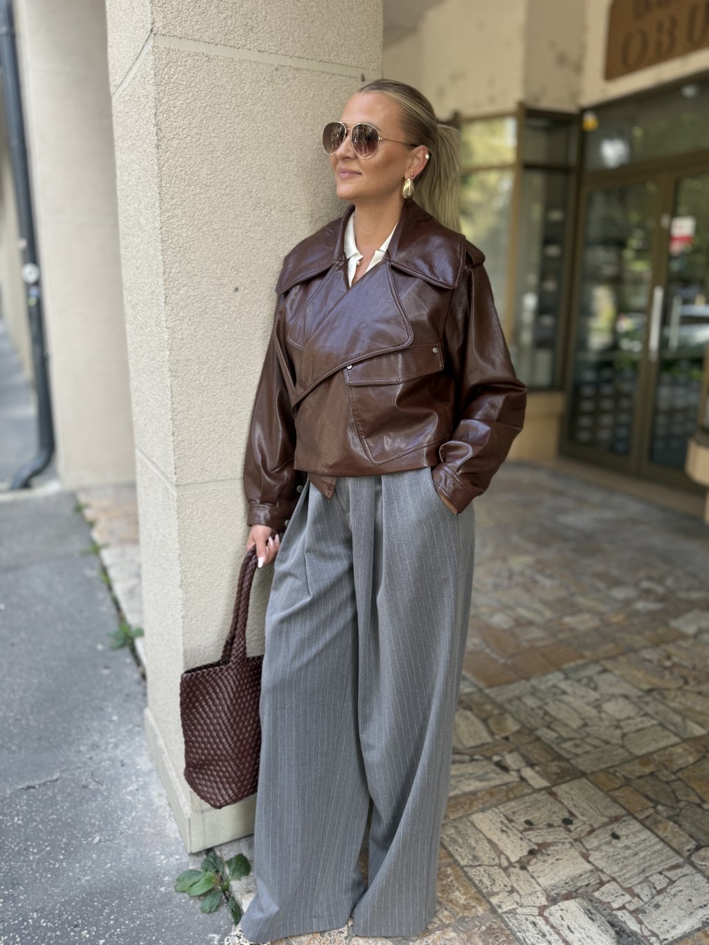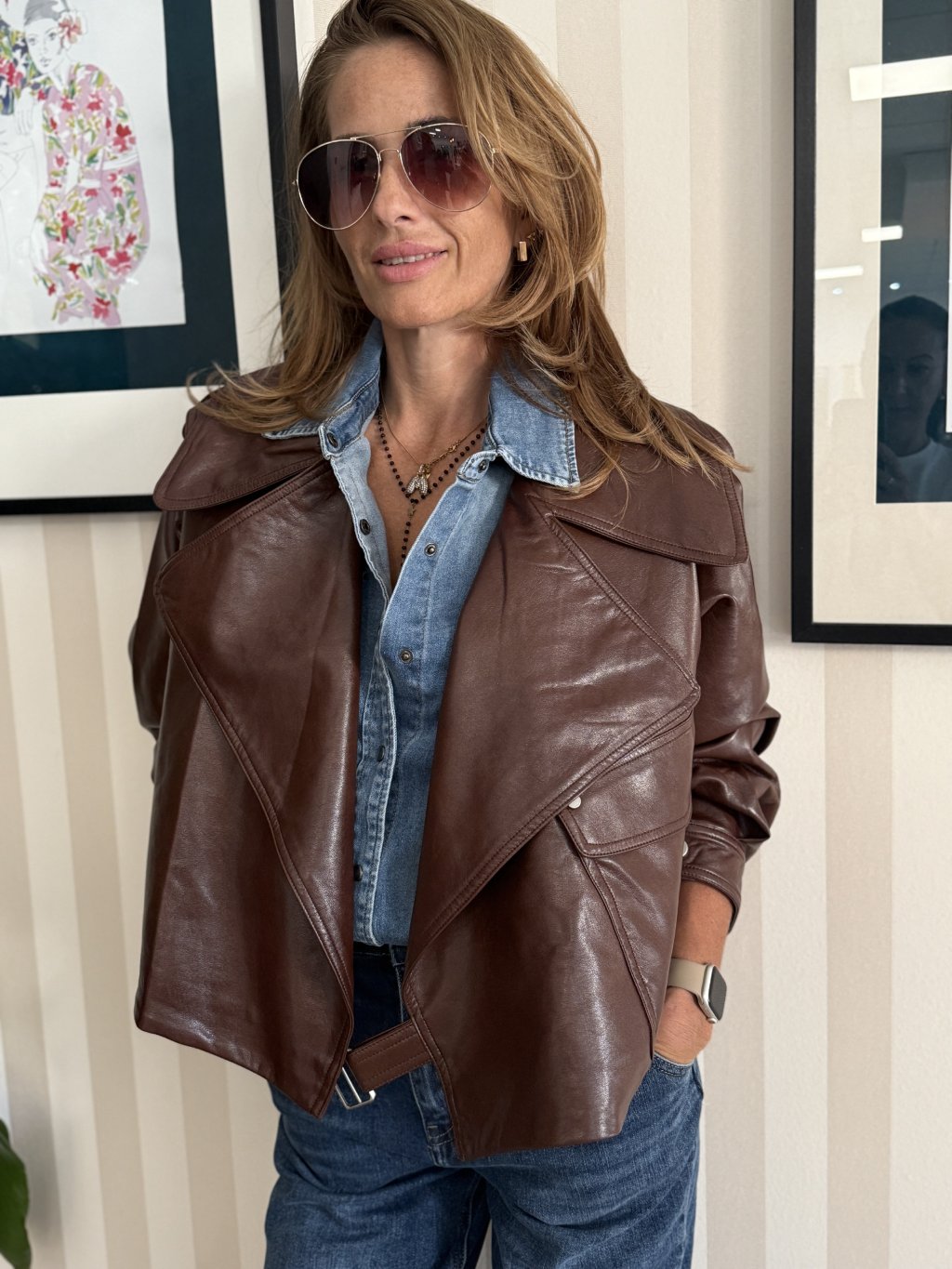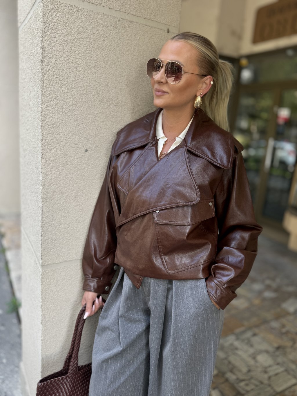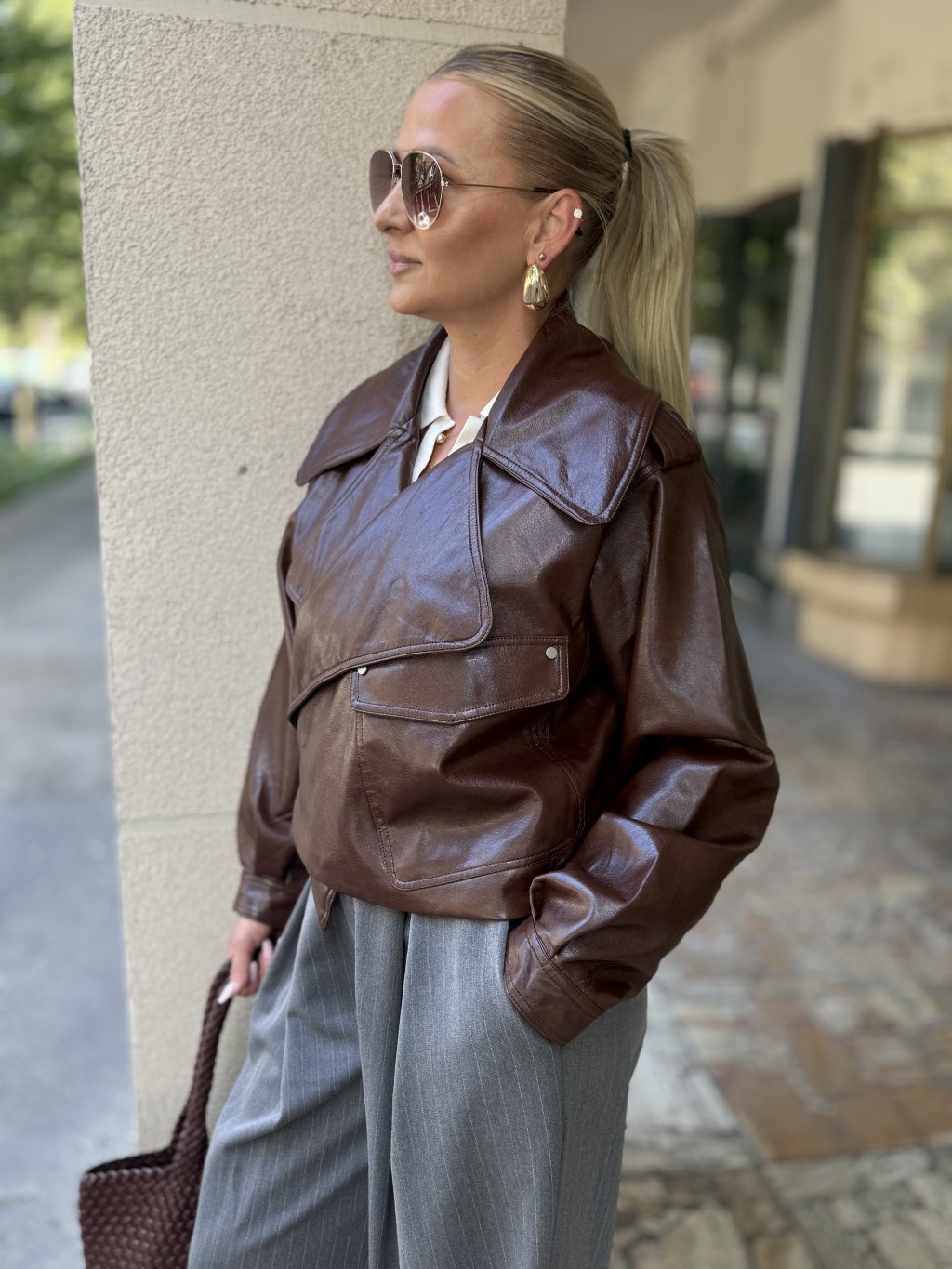 Kožená bunda v bohatej čokoládovo-hnedej farbe je ikonickým kúskom, ktorý okamžite dodá outfitu štýl a sebaistotu. Mäkká, na dotyk príjemná imitácia kože pôsobí luxusne a pritom zostáva pohodlná na každodenné nosenie. Vďaka oversize strihu a výraznému golieru bunda dokonale zapadne do aktuálnych trendov a vytvorí kontrast medzi eleganciou a ležérnosťou. Ideálna pre ženy, ktoré milujú módne kúsky s charakterom.