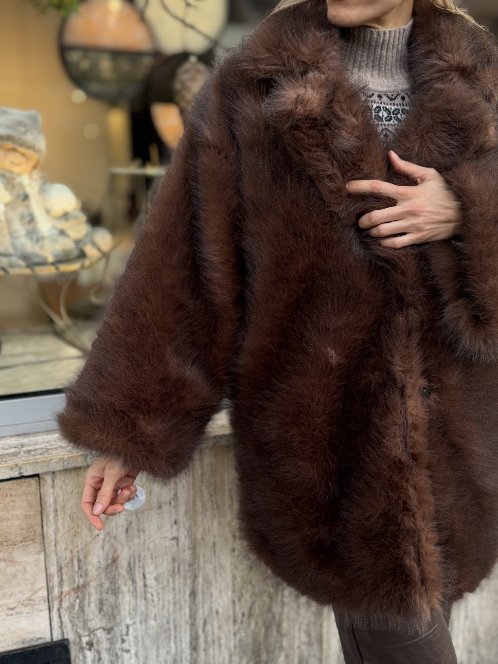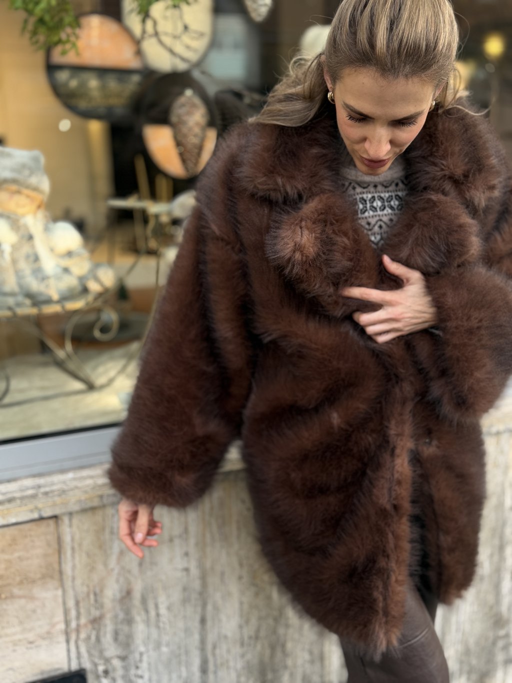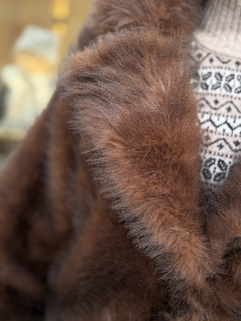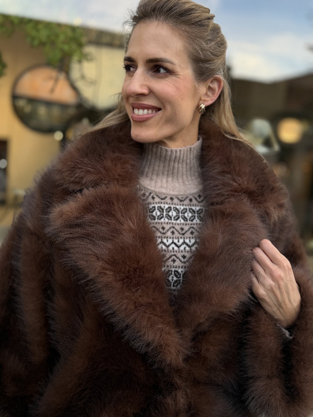 Kožuch Pelliccia v odtieni bohatej hnedej je presne ten kúsok, ktorý mení zimné dni na módny zážitok. Je jemný, mäkký a príjemne teplý – no zároveň ľahký a dobre nositeľný aj pri celodennom pohybe.