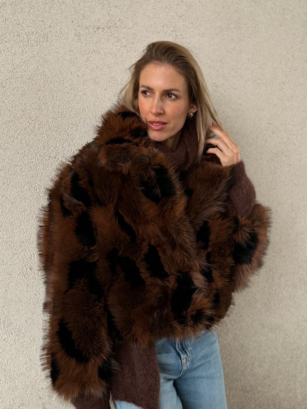 Tento kožúšok v hnedej farbe zaujme svojím leopardím vzorom, ktorý vytvára bohatý vizuálny efekt bez toho, aby pôsobil prehnane. Materiál je príjemný na dotyk a poskytuje hrejivý komfort počas chladných dní. Strih je pohodlný a ľahko kombinovateľný s denimom, pleteninami či elegantnejšími kúskami. Vďaka talianskemu prepracovaniu pôsobí model moderne, ženský a sofistikovaný zároveň.