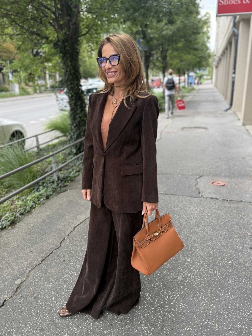 Kombinuj s menčestrovým sakom v rovnakej hnedej farbe pre ucelený monochromatický set. Pre kontrastný efekt pridaj krémovú košeľu s volánom alebo béžový sveter. Na doladenie zvoľ koženú kabelku v odtieni tabacco a výrazné okuliare pre mestský šik.