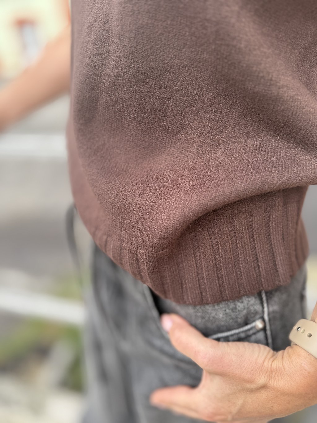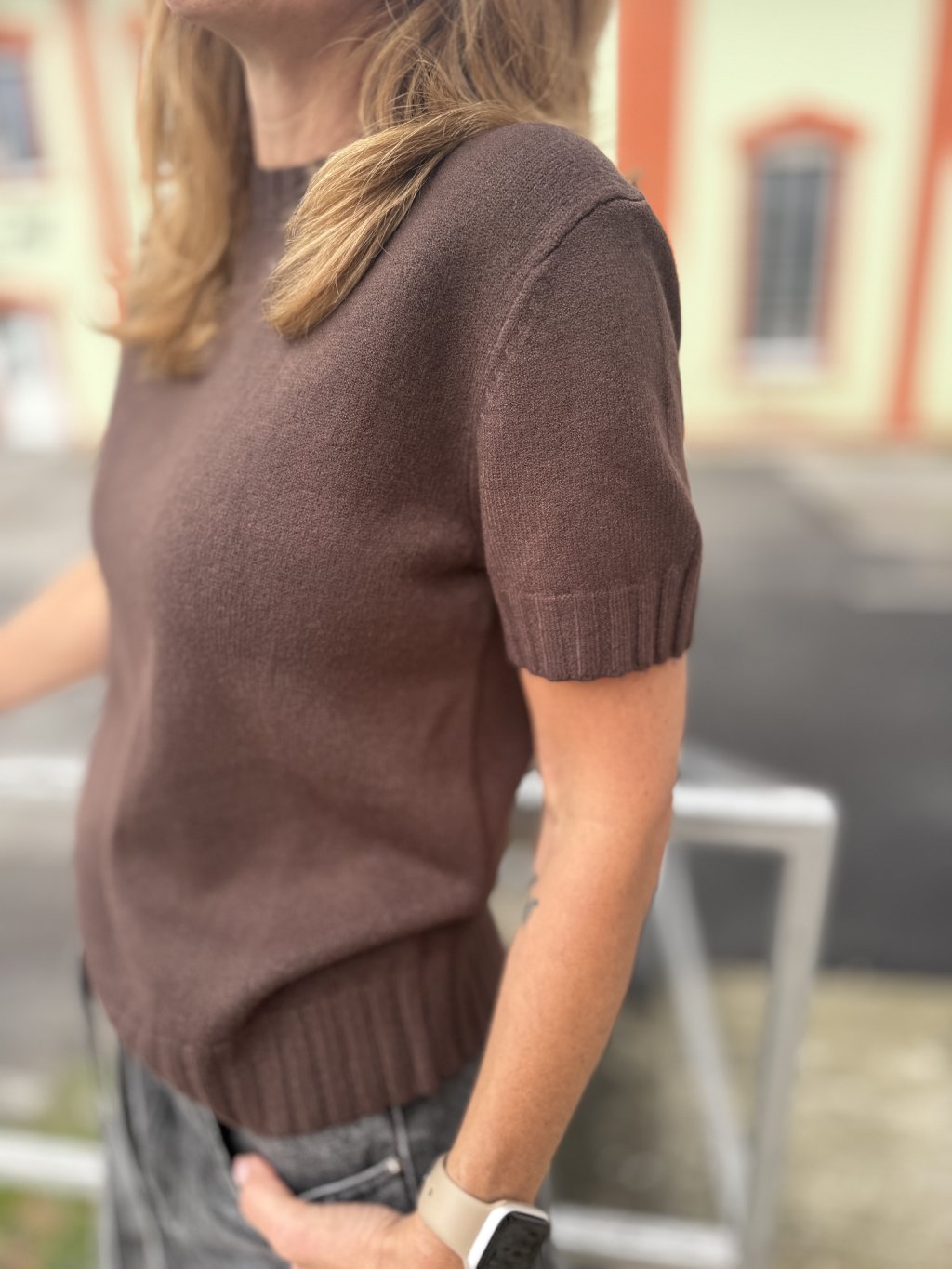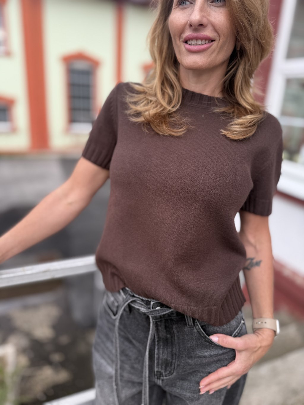 Hladký hnedý pletený top s krátkym rukávom je esenciálnym kúskom jesennej garderóby. Jeho minimalistický dizajn a nadčasový odtieň čokoládovej hnedej pôsobia elegantne a ľahko kombinovateľne. Vďaka jemnej, mäkkej priadzi a elastickému lemu je nielen štýlový, ale aj pohodlný. Perfektný pre ženy, ktoré ocenia jednoduchosť s dotykom sofistikovanosti.