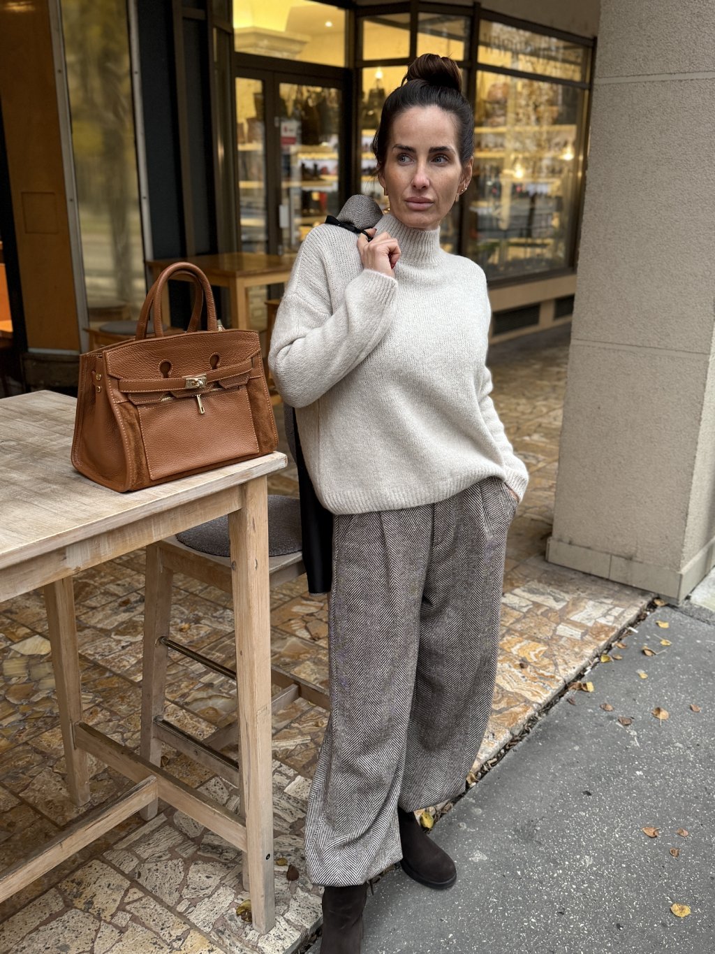 Noste s vlnenými nohavicami v rybej kosti a dlhým béžovým kabátom. Pre uvoľnený víkendový look kombinuj s džínsami a koženou hnedou kabelkou.
