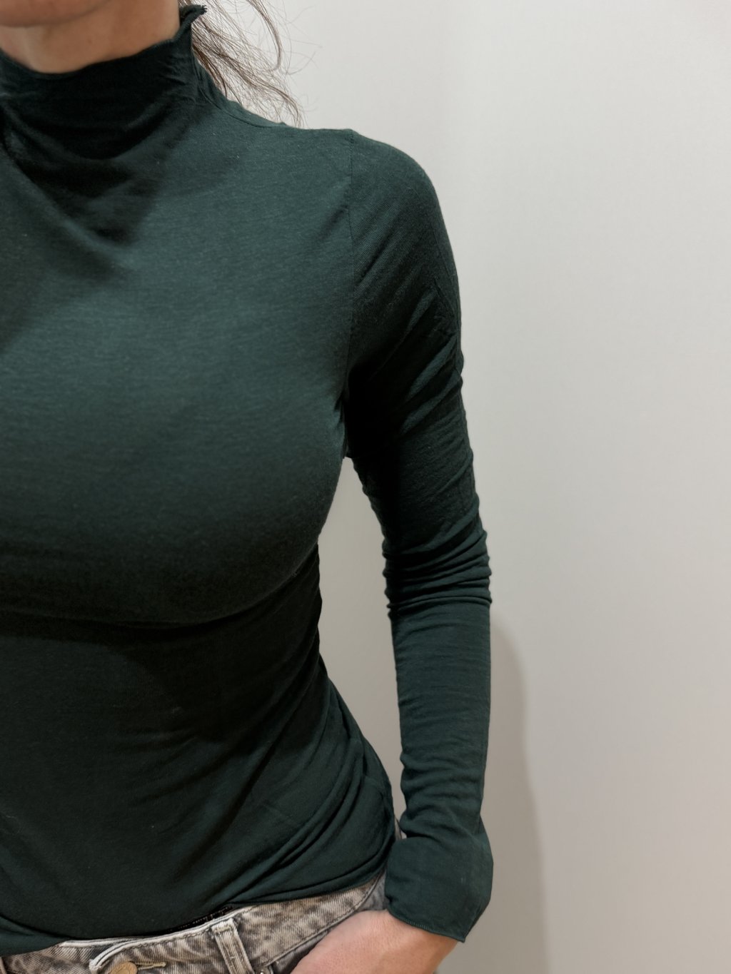 Tento zelený polorolák má mimoriadne jemnú textúru, ktorá vďaka podielu kašmíru pôsobí luxusne a príjemne na tele. Tenká pletenina sa krásne prispôsobí postave a vytvára hladký, čistý look vhodný na vrstvenie aj samostatné nosenie. Farba v hlbokom zelenom odtieni dodáva outfitu elegantný, moderný nádych. Vďaka talianskemu spracovaniu si model zachováva komfort aj estetiku počas celého dňa.