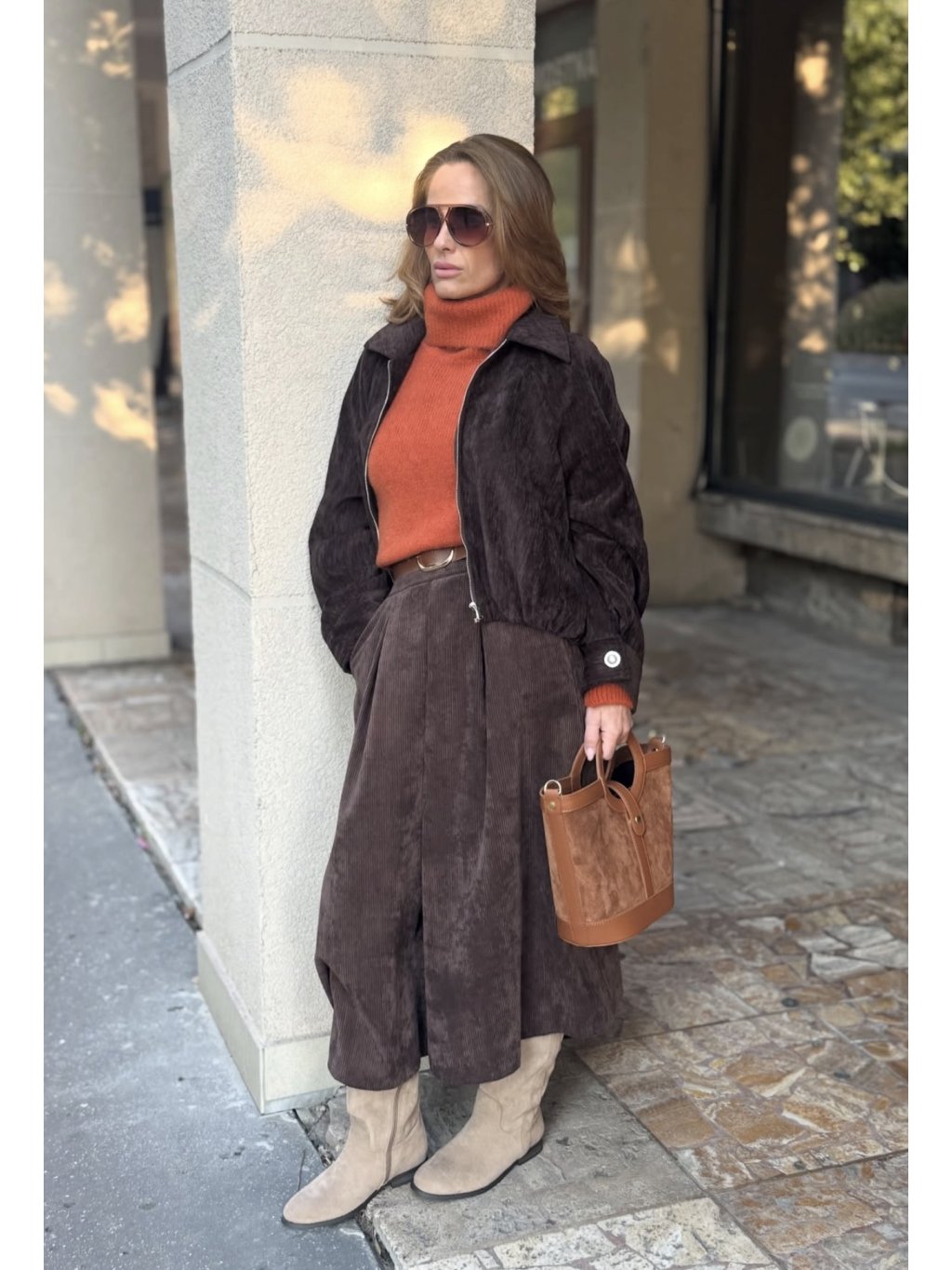 Bundu kombinuj so širokými manšestrovými nohavicami v rovnakom odtieni pre efekt súpravy – výsledok pôsobí mimoriadne sofistikovane. Ak preferuješ kontrast, zvoľ svetlý rolák v tehlovej alebo krémovej farbe a doplň look semišovými čižmami. Na dokonalé doladenie pridaj kabelku v teplom karamelovom tóne.