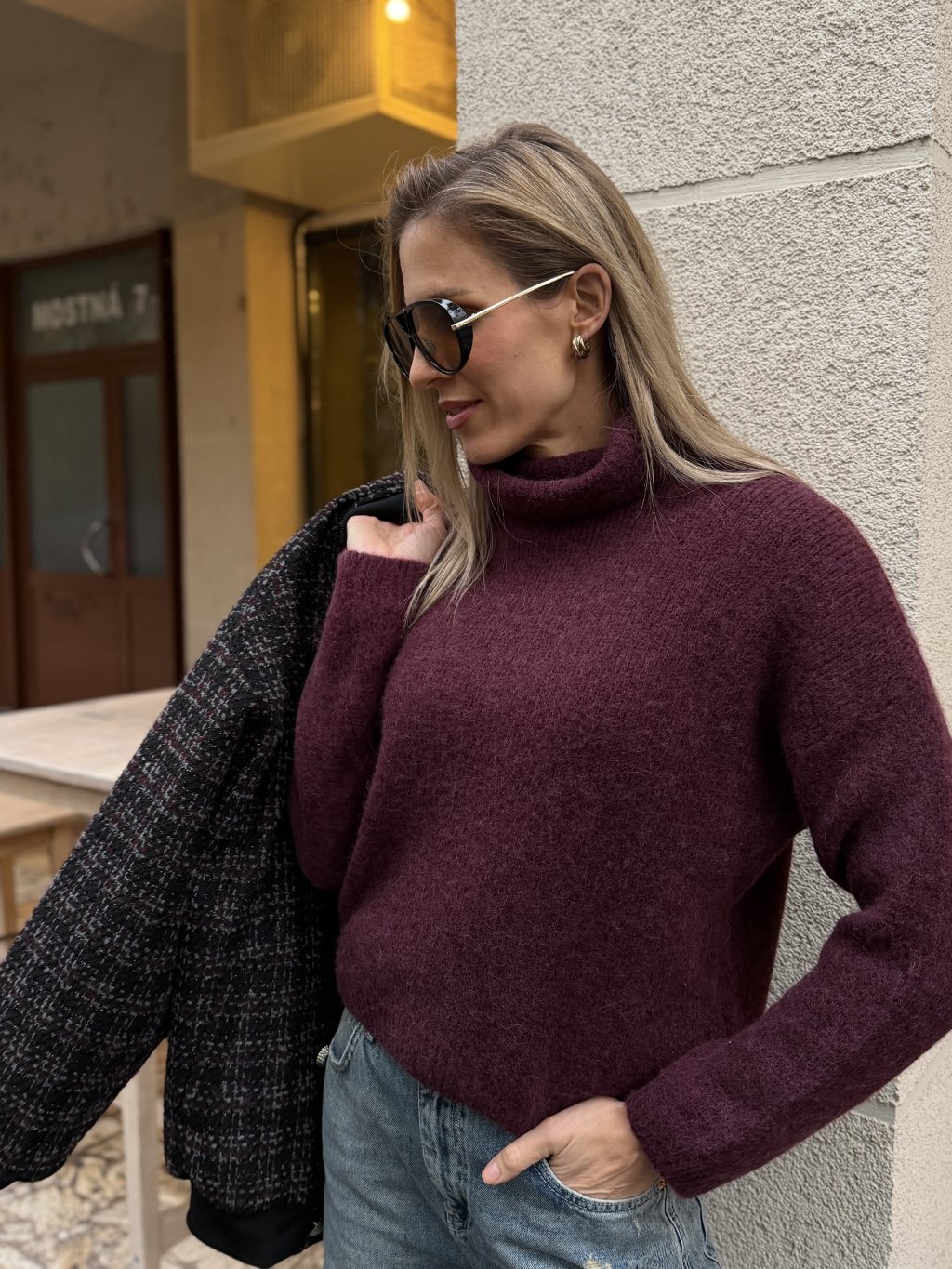 Tento hrubý rolák z baby alpaky je stelesnením talianskeho „quiet luxury“. Jeho mäkučká, nadýchaná pletenina v hlbokom burgundy odtieni pôsobí hrejivo, jemne a mimoriadne sofistikovane. Stojačik krásne obopína krk a vytvára elegantnú zimnú líniu, ktorá lichotí postave aj v uvoľnenom strihu. Burgundy farba pôsobí zmyselne a výborne dopĺňa denim, čiernu, béžovú či kožené doplnky. Je to kúsok, ktorý si oblečieš počas chladných dní a nebudeš ho chcieť vyzliecť – komfort, ktorý nepopiera ženskosť.