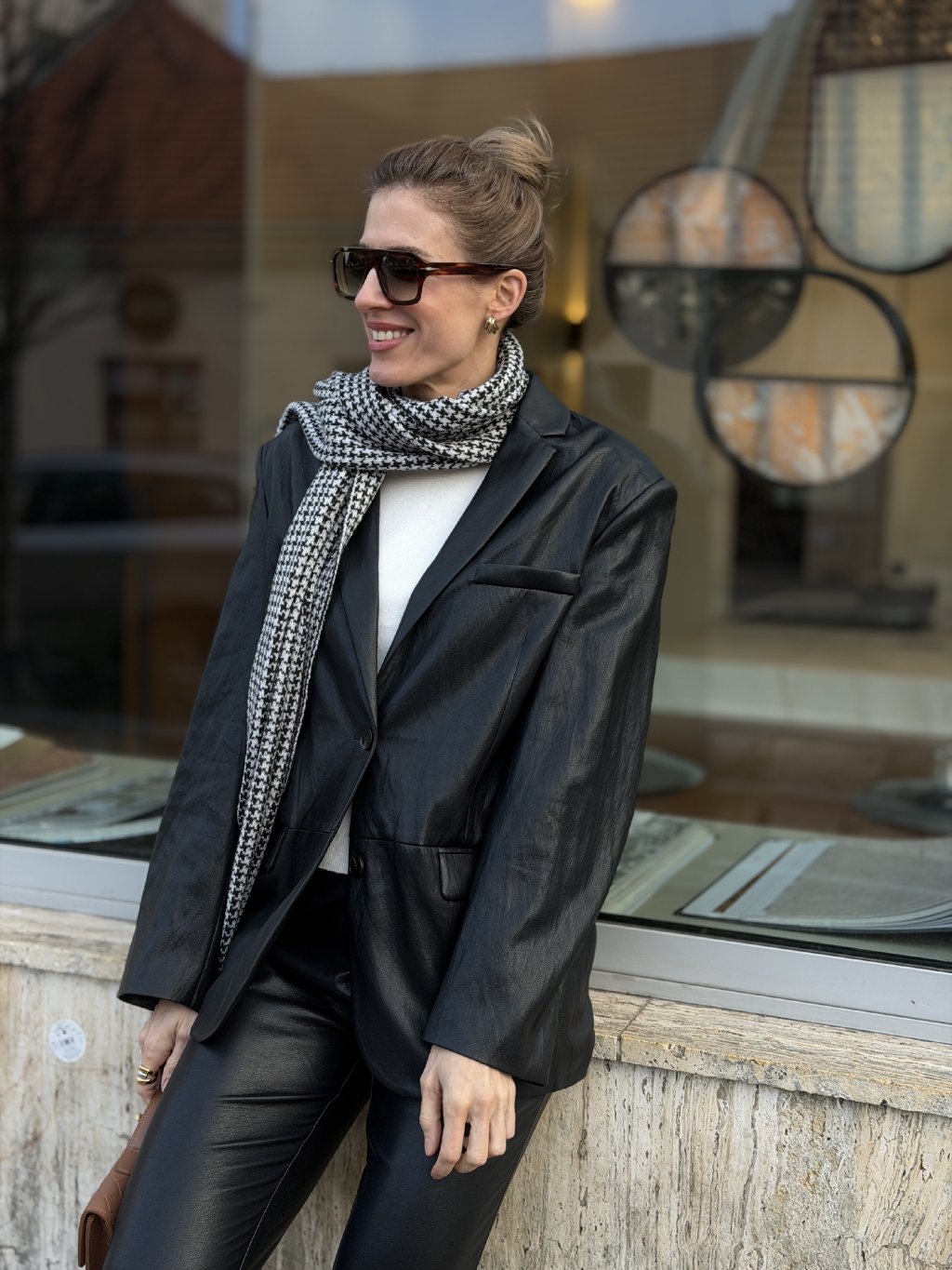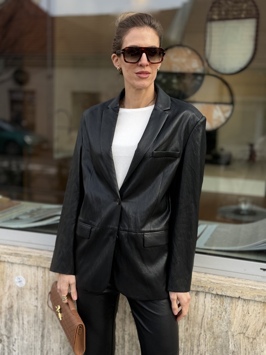 Strih je čistý, mierne uvoľnený, s klasickými klopami a zapínaním na jeden gombík. Čierny odtieň podčiarkuje univerzálnosť kúsku a robí z neho ideálnu voľbu pre ženy, ktoré preferujú minimalistický, mestský štýl s dôrazom na kvalitu a nadčasovosť.