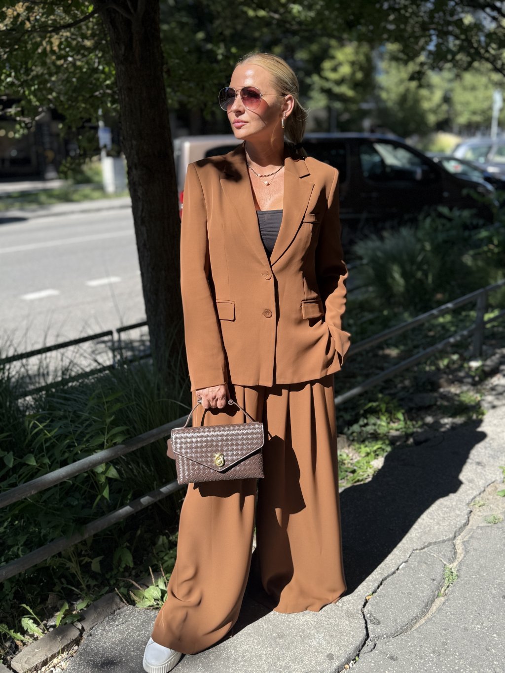 Elegantné komplety v odtieňoch čokoládovej a gaštanovej hnedej sú kúskom, ktorý využiješ od business meetingu až po večerné stretnutie v meste.Široké nohavice + dokonale padnúce sako = kombinácia, ktorá nikdy nevyjde z módy.