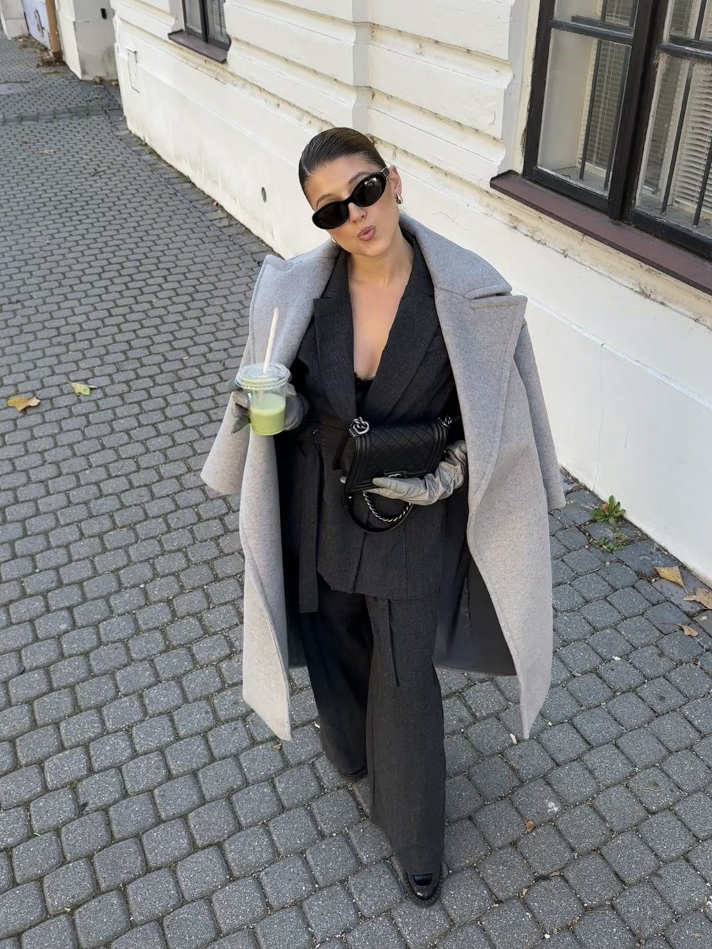 Vytvor full suit so sivými širokými nohavicami a čiernou kabelkou s reťazou – výsledok pôsobí veľmi „city chic“.