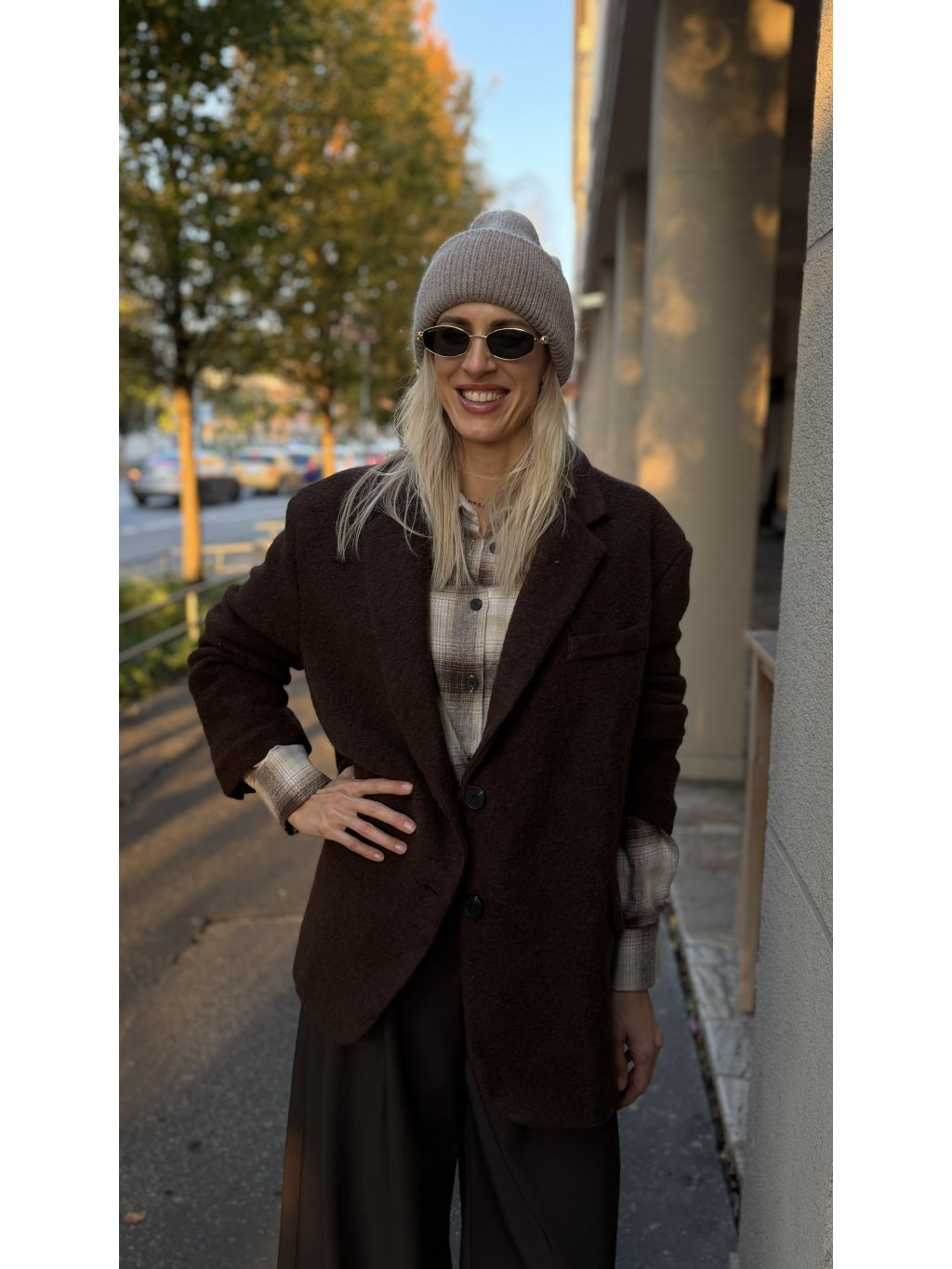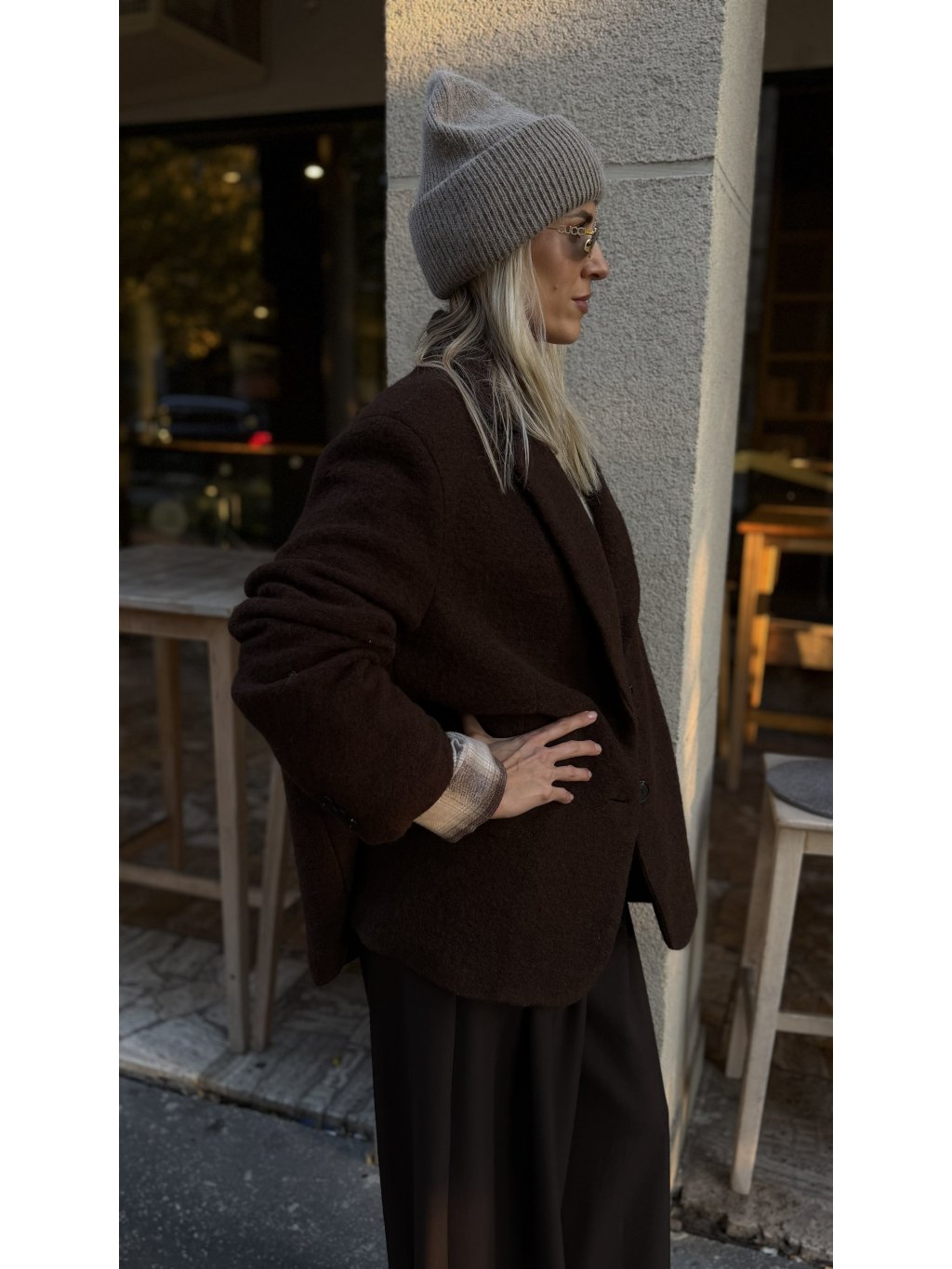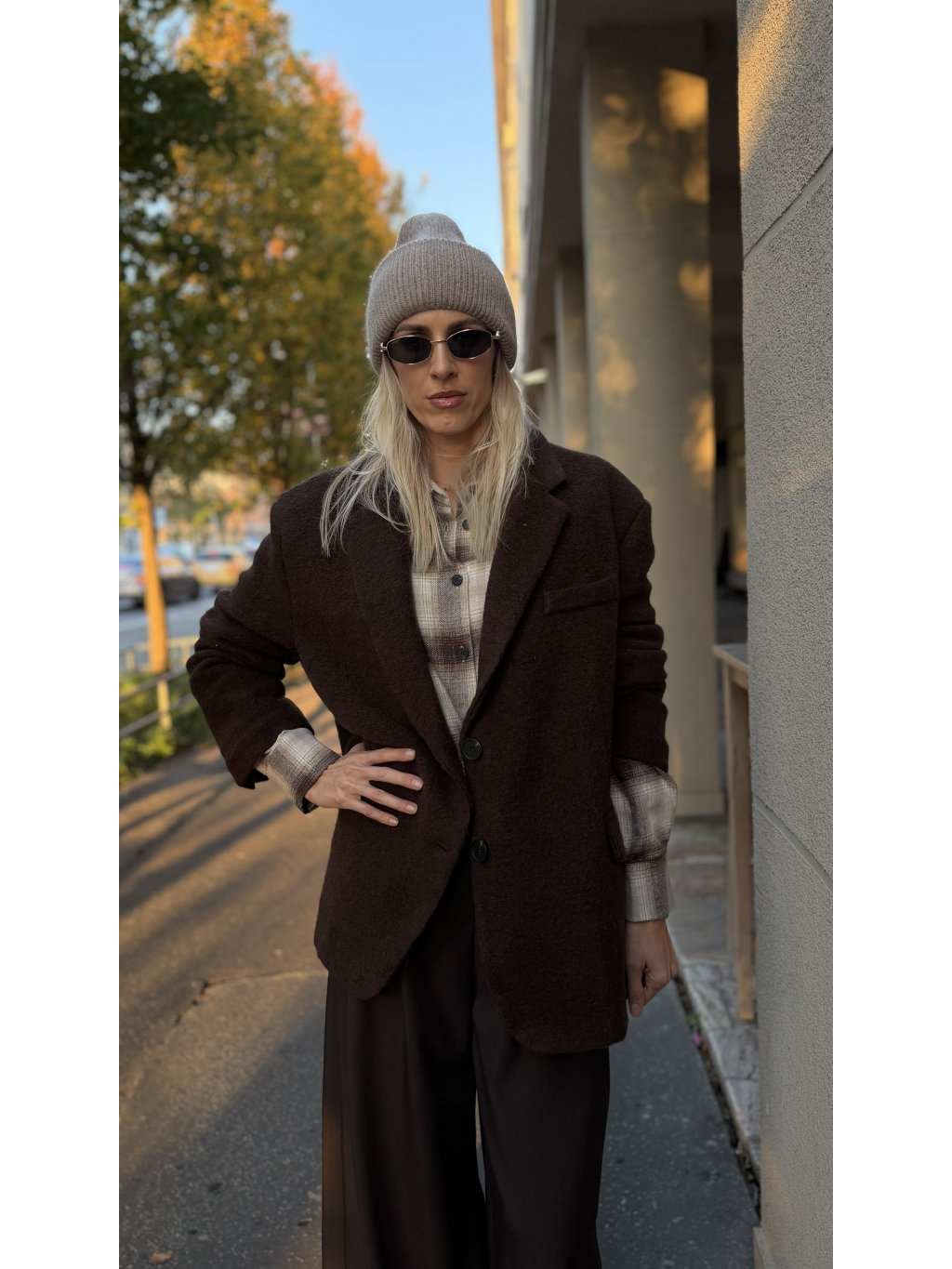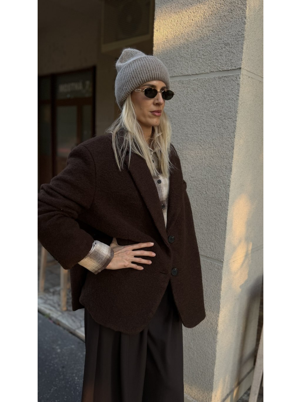Toto vlnené sako v hlbokej hnedej farbe je kúskom, ktorý okamžite dodá outfitu teplo, štruktúru a taliansku nenútenú eleganciu. Má jemne oversize strih, ktorý pôsobí uvoľnene, no zároveň veľmi šik – presne ten balans, ktorý hľadáme pri jesenných a zimných vrstvách.