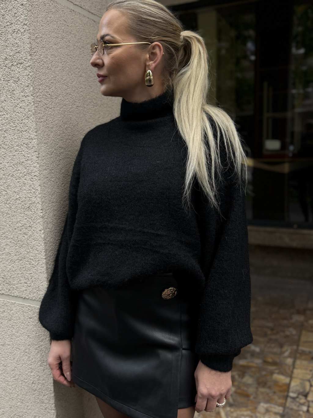 Dizajn dopĺňa zlaté kovové tlačidlo a decentný rozparok, ktoré dodávajú outfitu sofistikovaný charakter. Vďaka univerzálnej čiernej farbe sa ľahko kombinuje so svetrami, blúzkami aj sakami.