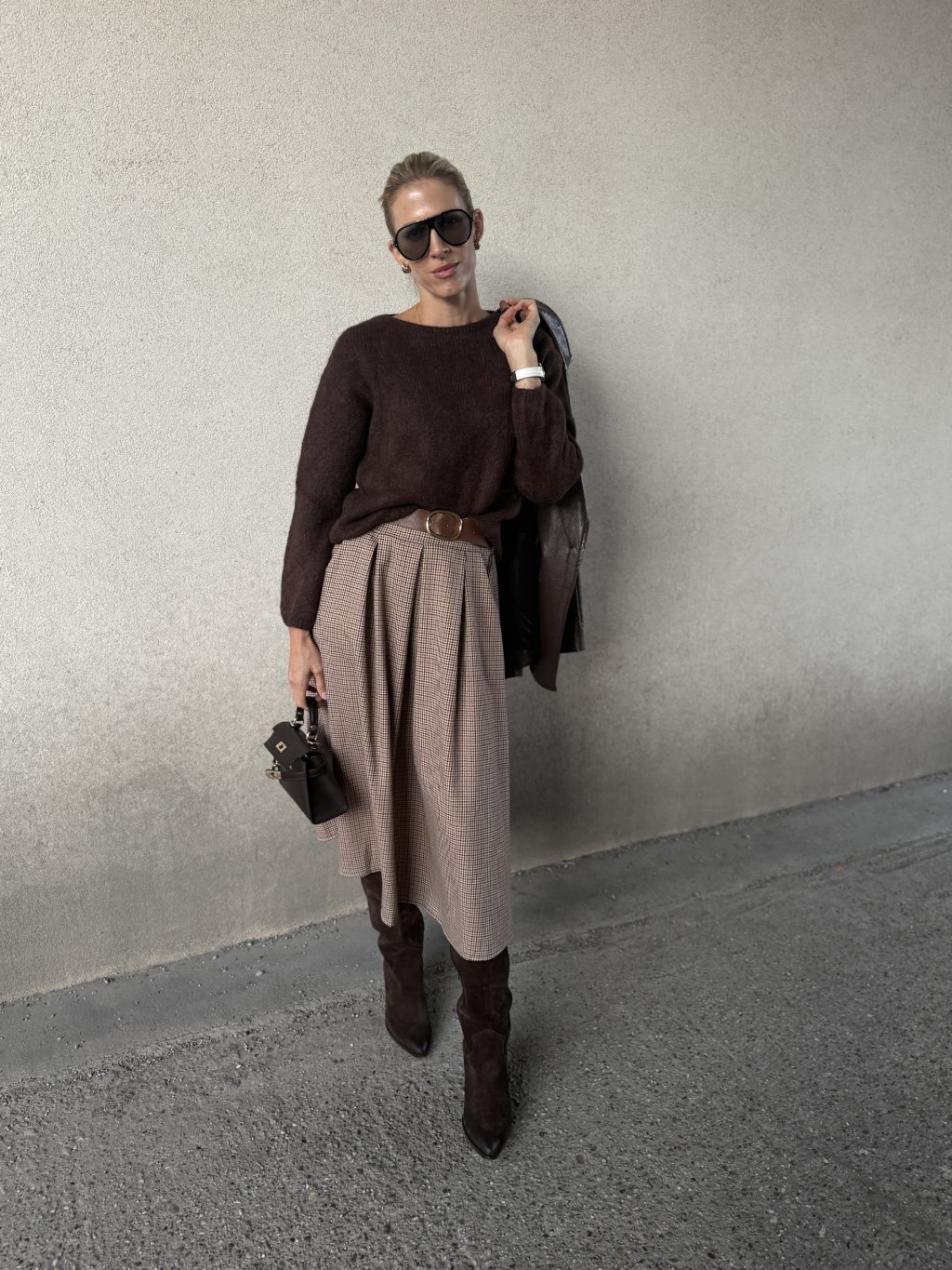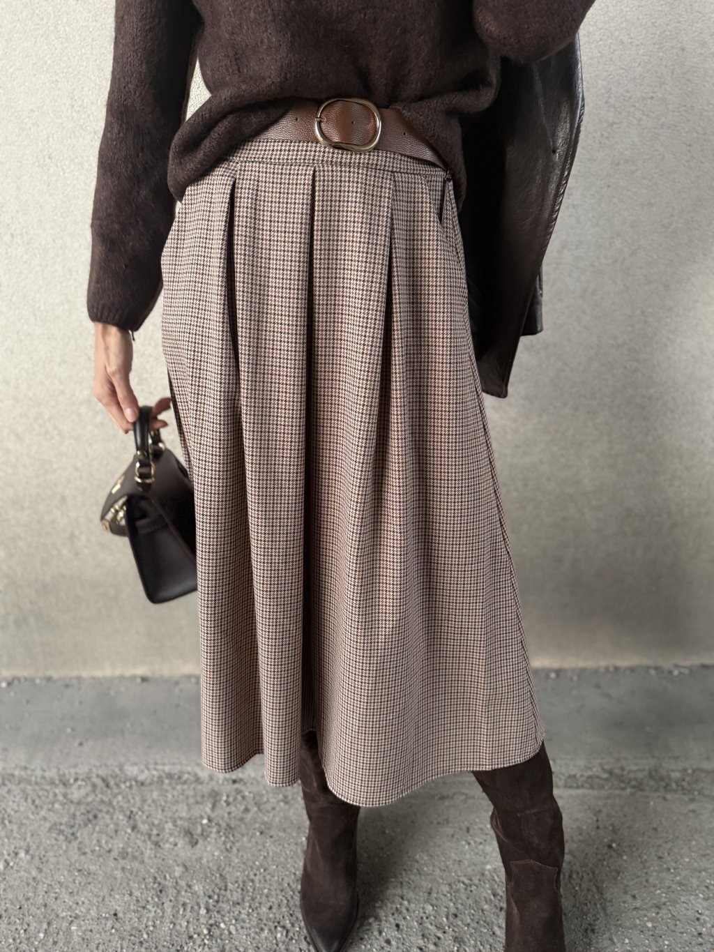 Sukňa s jemným káro vzorom v zemitých tónoch prináša nadčasovú eleganciu v modernom poňatí. Jej midi dĺžka a jemne rozšírený strih pôsobia žensky a rafinovane, zatiaľ čo skladané detaily dodávajú objem a pohyb.