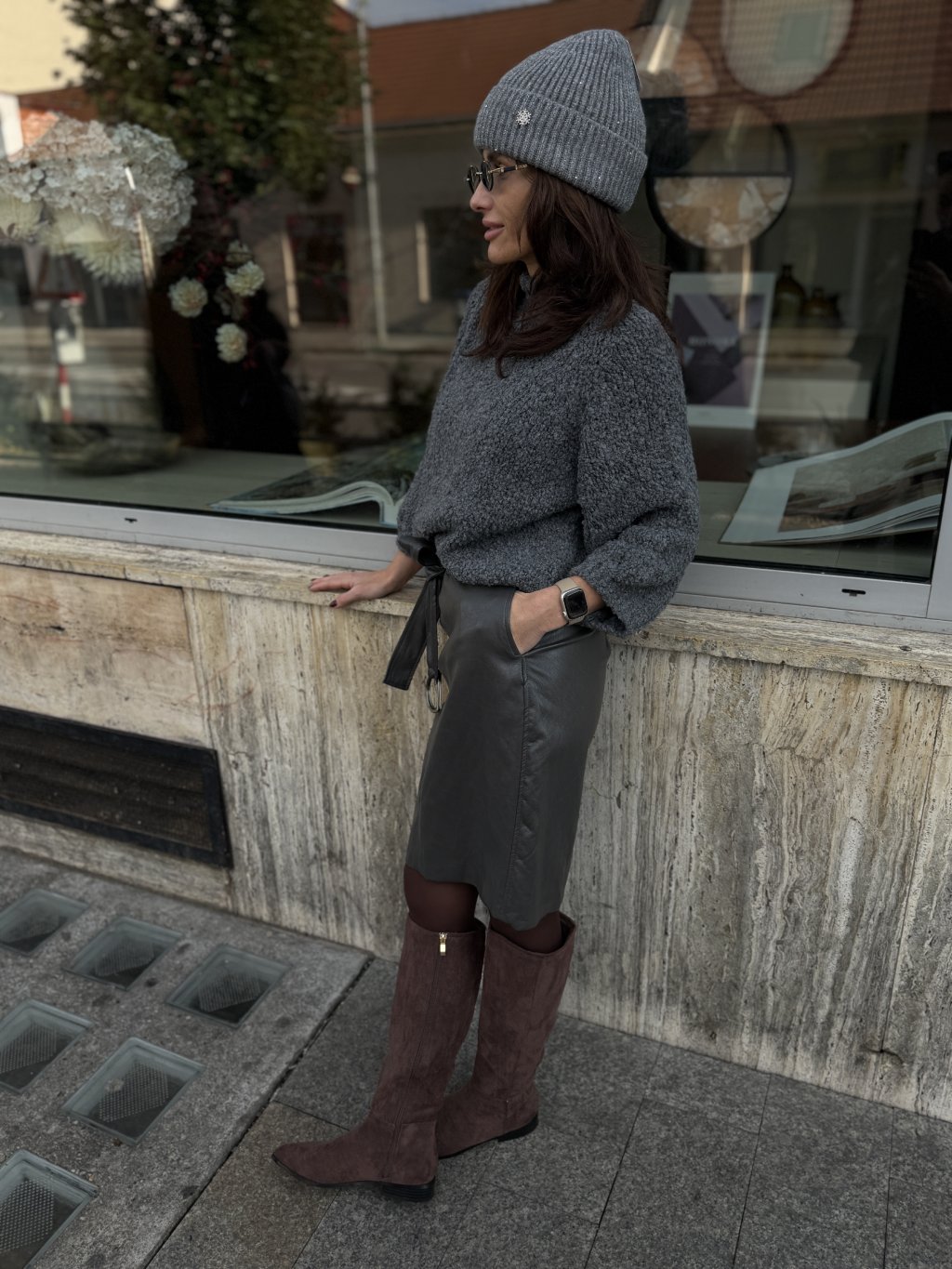 Detailom, ktorý ju odlišuje, je kožený opasok s kovovým krúžkom, ktorý dodáva celému kúsku sofistikovaný nádych. Materiál s jemným leskom imituje pravú kožu, no zostáva ľahký a príjemný na nosenie.