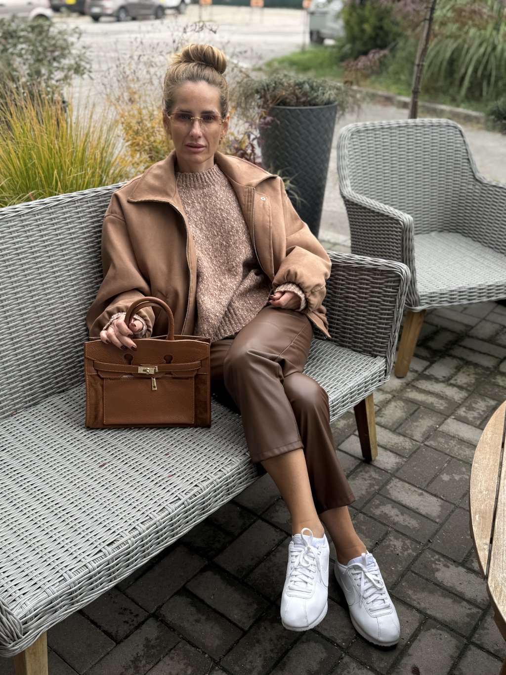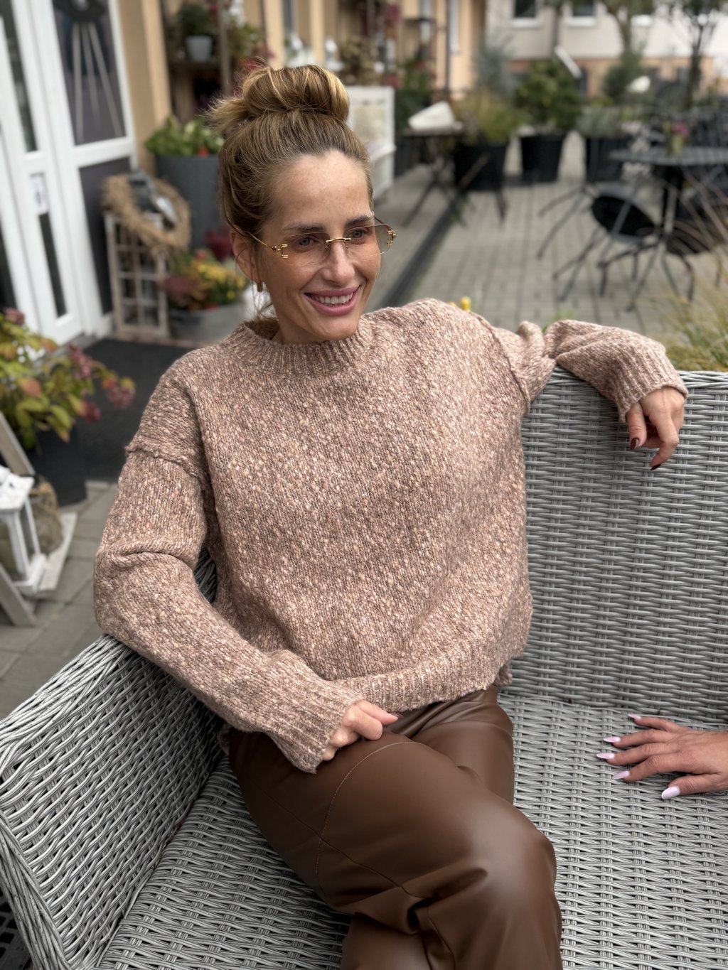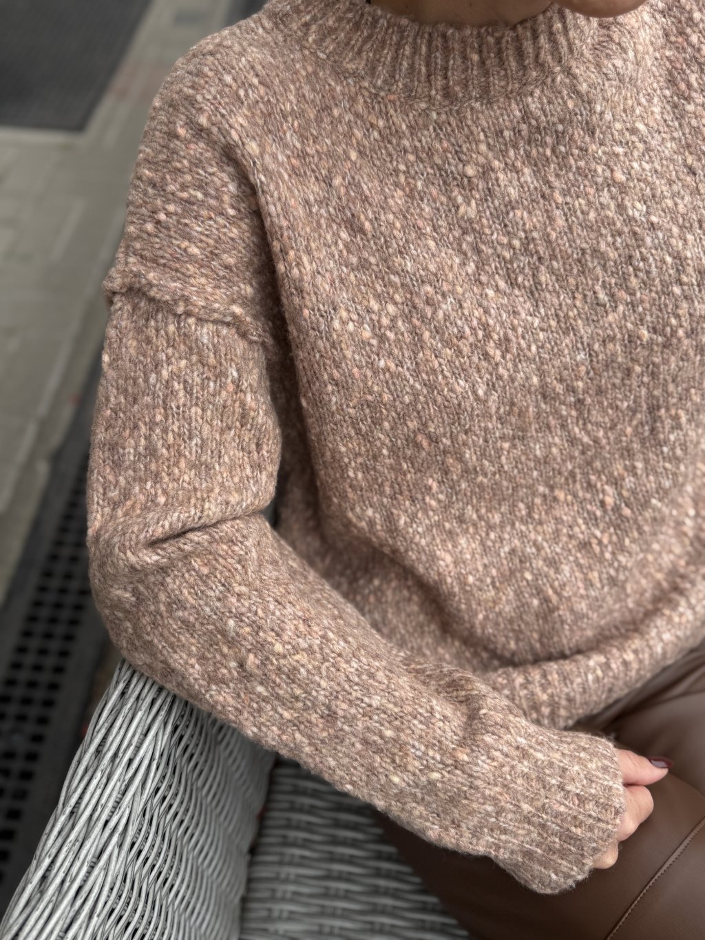 Kombinuj s koženkovými nohavicami alebo midi sukňou v odtieňoch čokoládovej či krémovej. Pre dotyk luxusu pridaj zlaté doplnky alebo kabelku v odtieni camel.