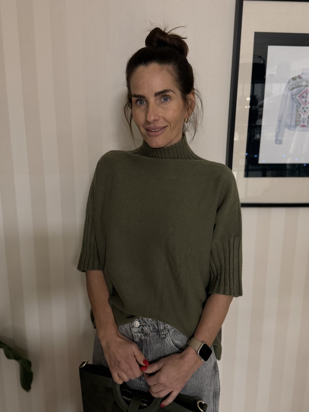 Zlaď ho so šedým denimom alebo koženými nohavicami. Pre vytvorenie tón v tóne looku pridaj khaki kabelku alebo béžový kabát pre jemný kontrast.