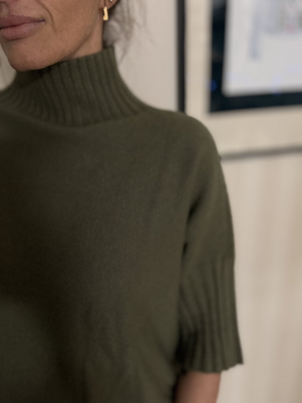 Tento khaki sveter patrí medzi tie kúsky, ktoré okamžite navodia pocit útulnosti a nenútenej elegancie. Mäkká pletenina sa príjemne prispôsobí telu, zatiaľ čo široké rebrované rukávy dodávajú modelu moderný, uvoľnený charakter. Stojačik jemne obopne krk a vytvára čistú líniu vhodnú na jesenné aj zimné vrstvenie. Khaki odtieň pôsobí vyrovnane, zemito a výborne dopĺňa denim, čiernu, béžovú či kožené kúsky. Sveter má taliansky podtón – jednoduchý, ale s prekvapivo luxusným vyznením.