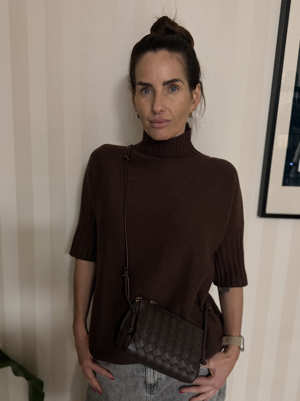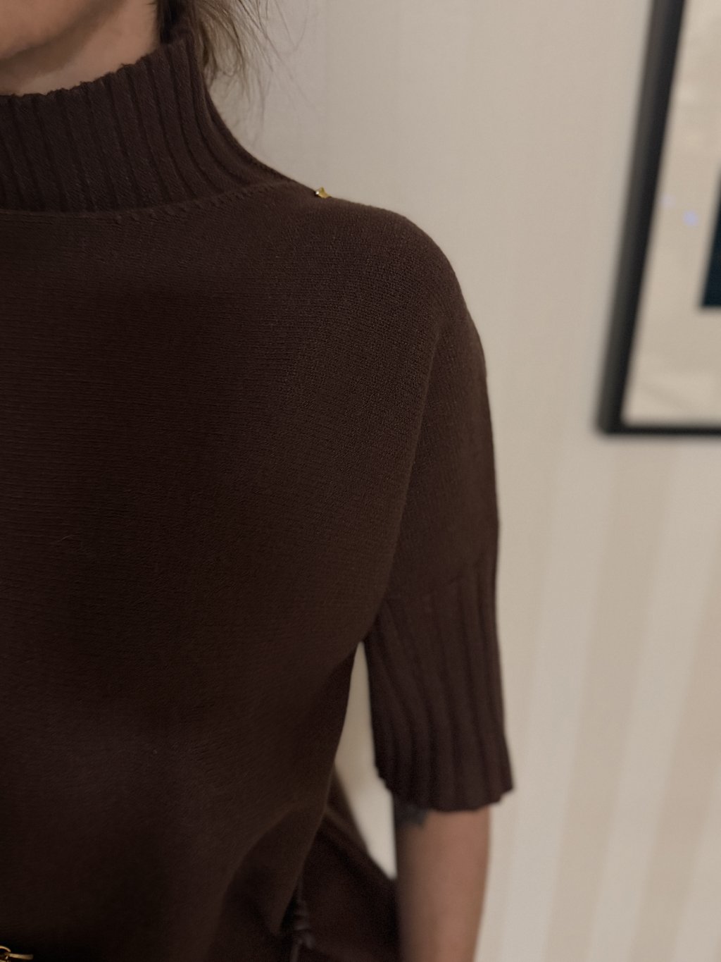 Tento sveter v hlbokom hnedočokoládovom odtieni okamžite vytvorí pocit útulnosti a nenúteného luxusu. Mäkká pletenina obopne siluetu s ľahkosťou, zatiaľ čo mierne rozšírené rukávy s výrazným rebrovaním pôsobia modernejšie než klasické prevedenia. Stojačik elegantne predlžuje krk a vytvára čistú, upravenú líniu vhodnú na denné aj večerné kombinácie. Farba, ktorú využiješ počas celej jesene a zimy, harmonicky ladí s denimom, béžovou, čiernou aj koženými doplnkami. Je to presne ten taliansky typ svetra, ktorý vyzerá žensky bez snahy.