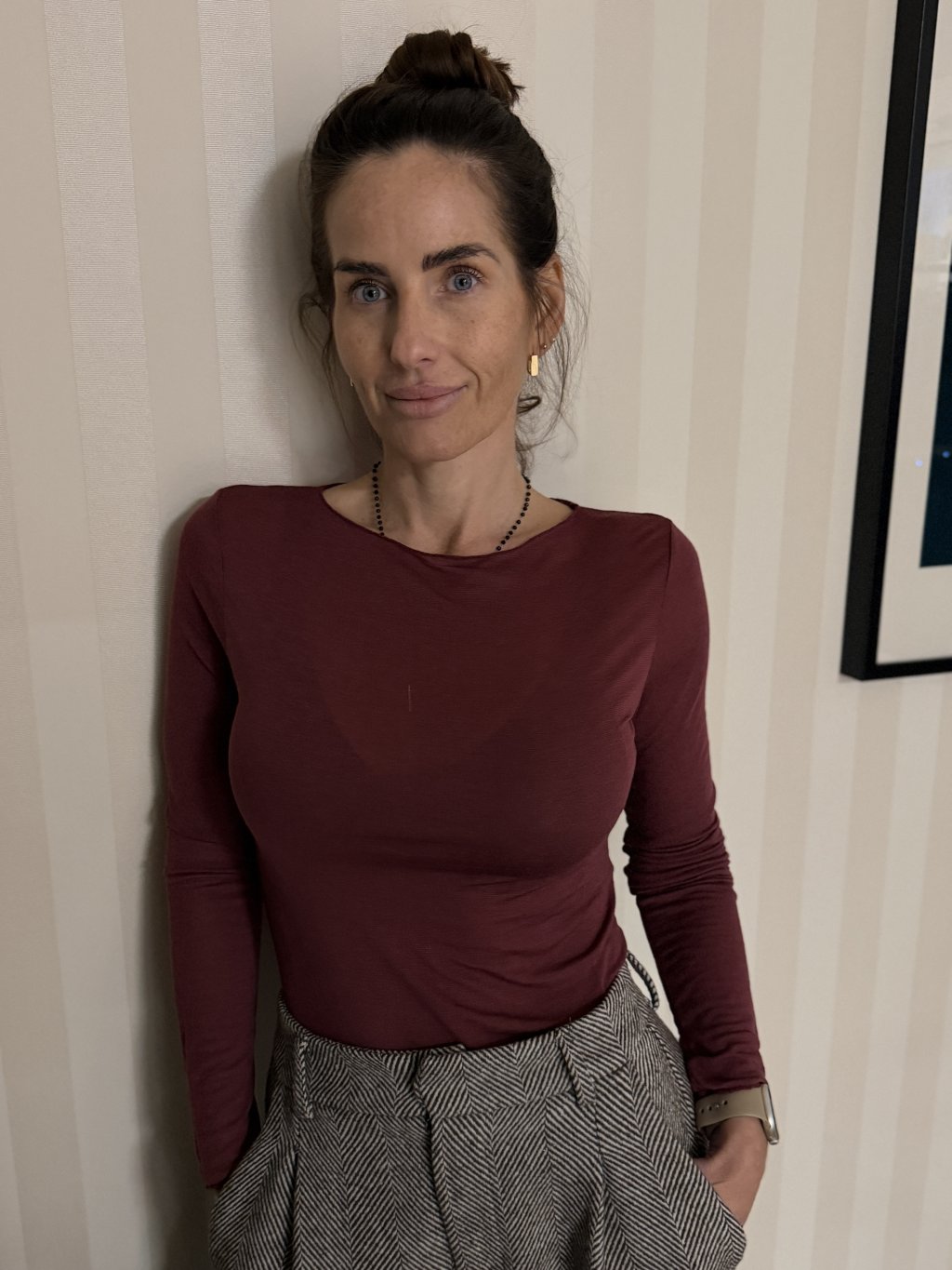 Toto burgundy tričko s dlhým rukávom je jedným z tých kúskov, ktoré fungujú ako diskrétny základ šatníka, no pôsobia nesmierne žensky. Hladká, tenká pletenina príjemne priľne k pokožke, nepôsobí ťažko a vďaka kašmíru má jemný, luxusný dotyk. Tenká silueta vytvára upravený vzhľad, ktorý sa výborne kombinuje pod saká, kabáty aj pleteniny. Burgundy odtieň dodáva outfitu hĺbku a eleganciu bez toho, aby bol príliš výrazný. Kúsok, ktorý oceníš najmä v prechodnom období alebo ako spodnú vrstvu počas chladnejších dní.