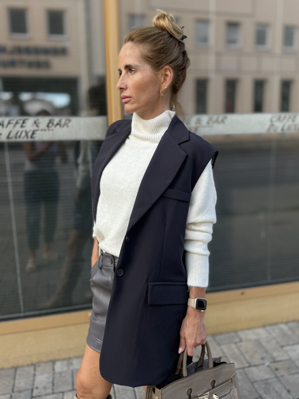 Elegantná tmavomodrá vesta s predĺženým strihom je dokonalým kúskom pre ženy, ktoré milujú modernú jednoduchosť a nadčasový štýl. Vyrobená z kvalitného, pevnejšieho materiálu, drží tvar a pôsobí upravene počas celého dňa. Klasické klopy, minimalistické vrecká a dvojité zapínanie podčiarkujú jej štruktúrovaný vzhľad. Ideálna ako vrchná vrstva na rolák, košeľu alebo tenký sveter.