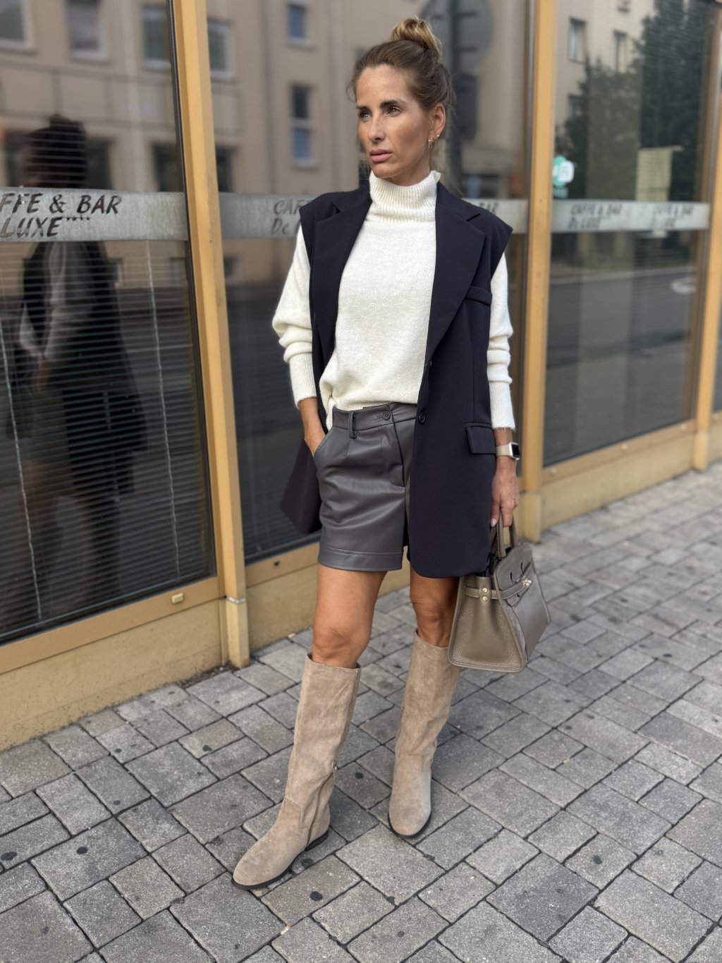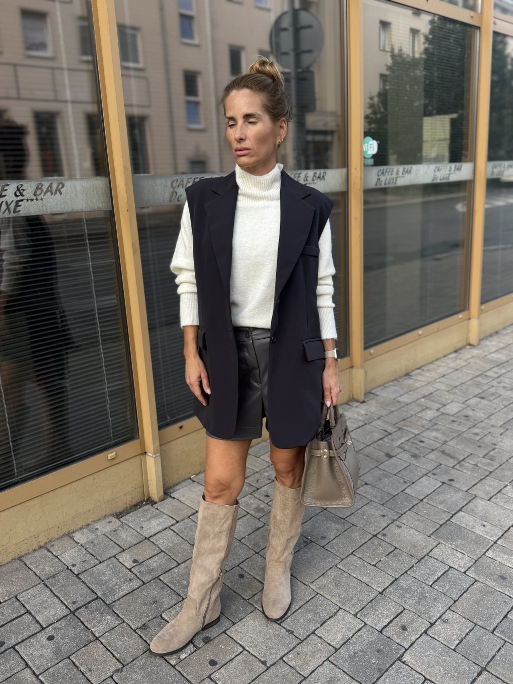 Skombinujte s bielym rolákom, úzkou sukňou a kabelkou v neutrálnom odtieni pre sofistikovaný business look. Na bežný deň ju môžete nosiť aj s džínsami a teniskami.